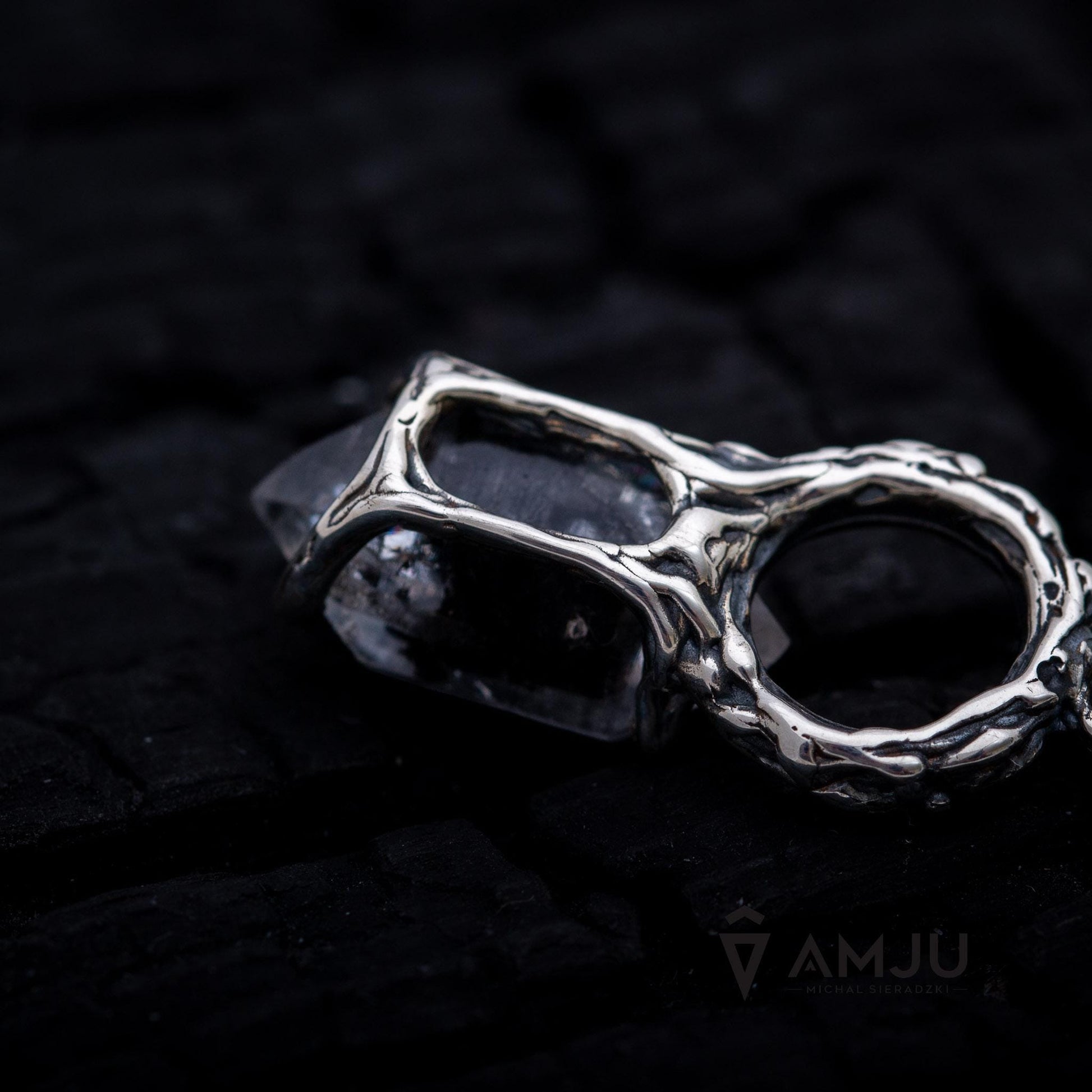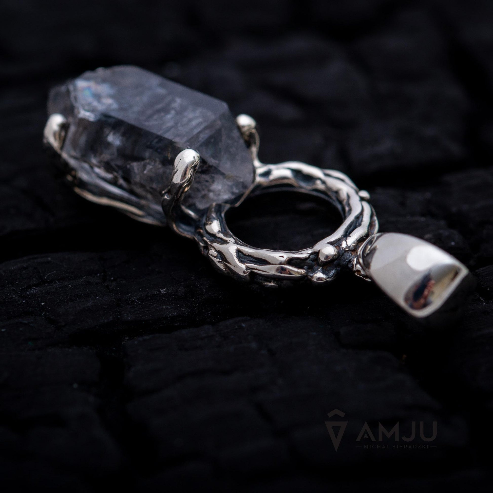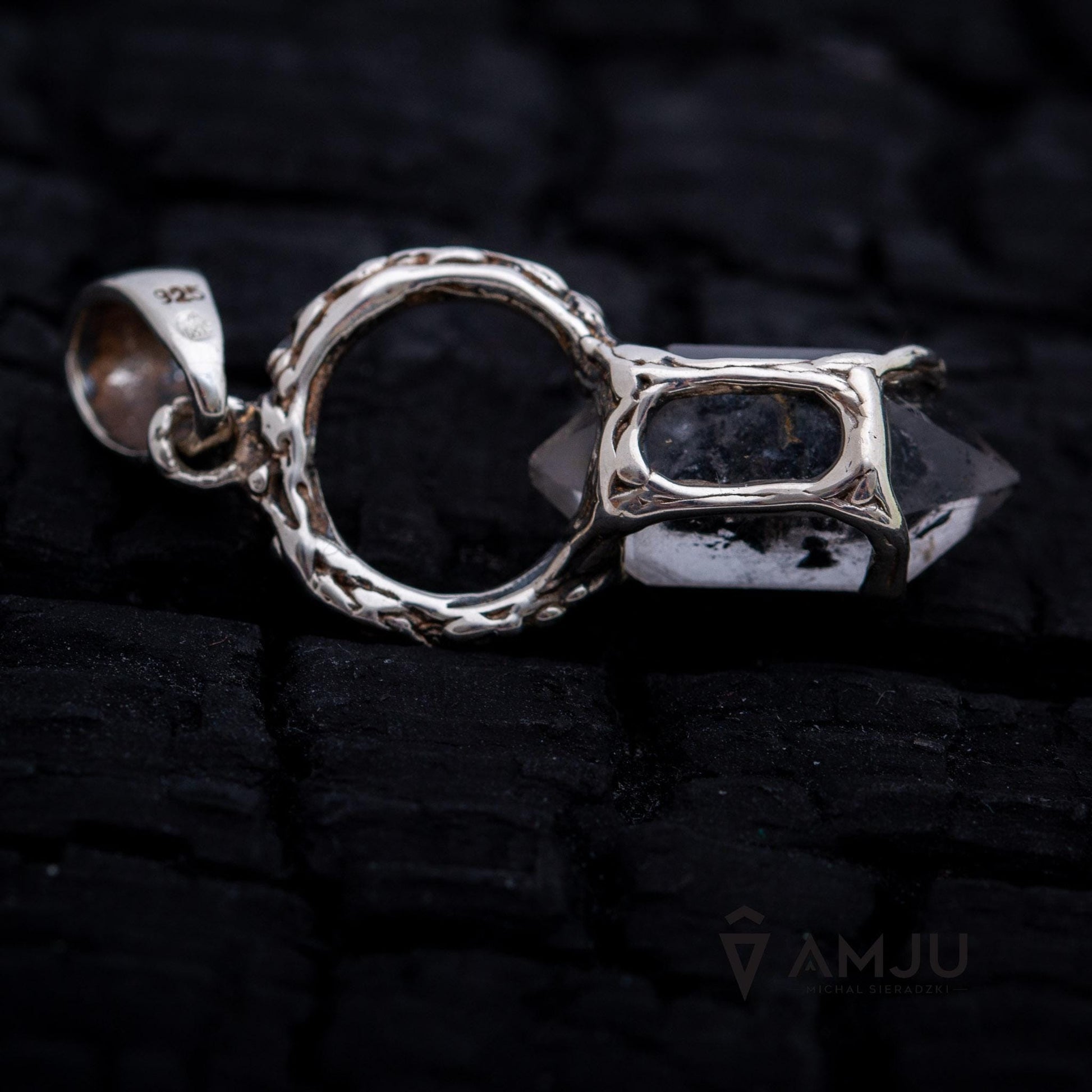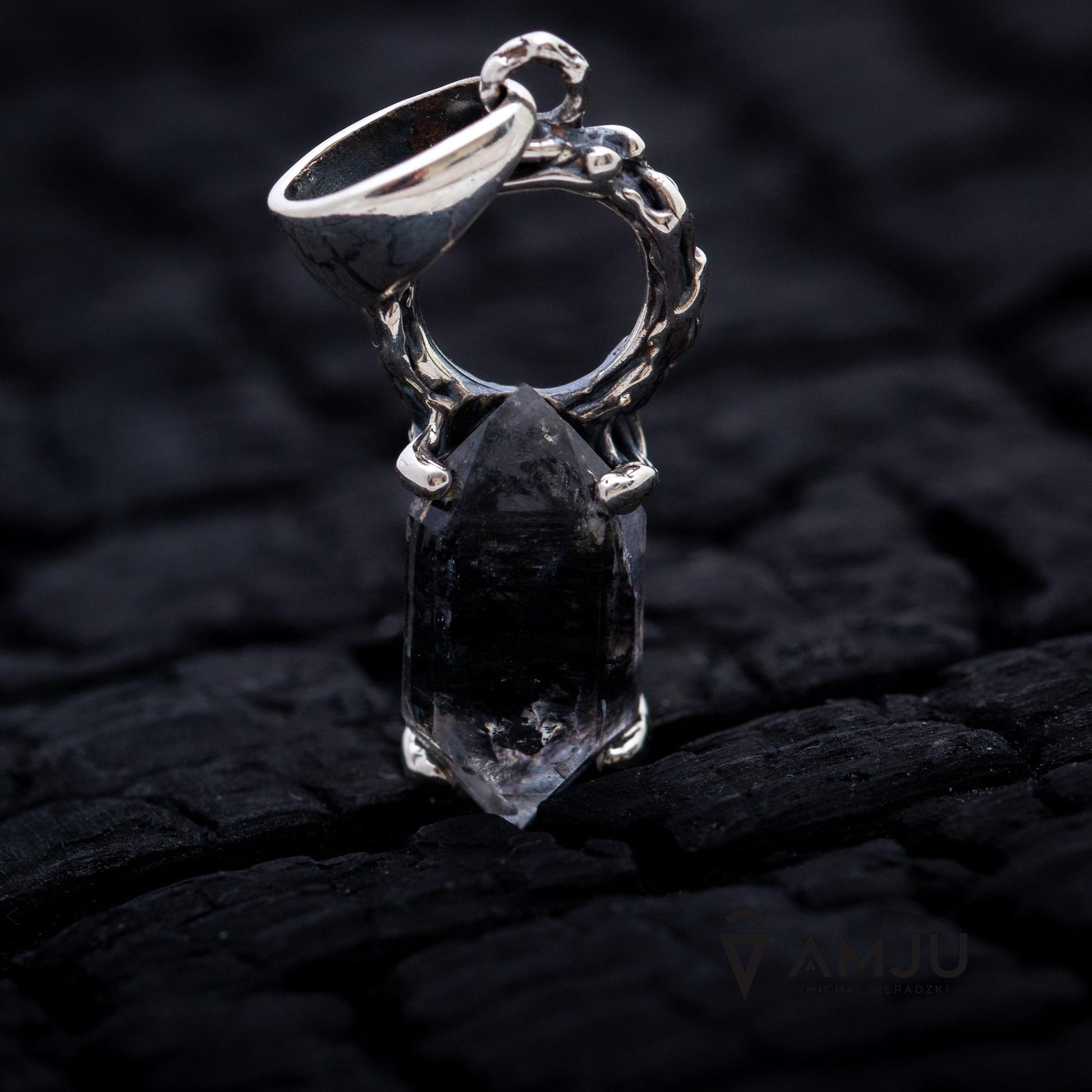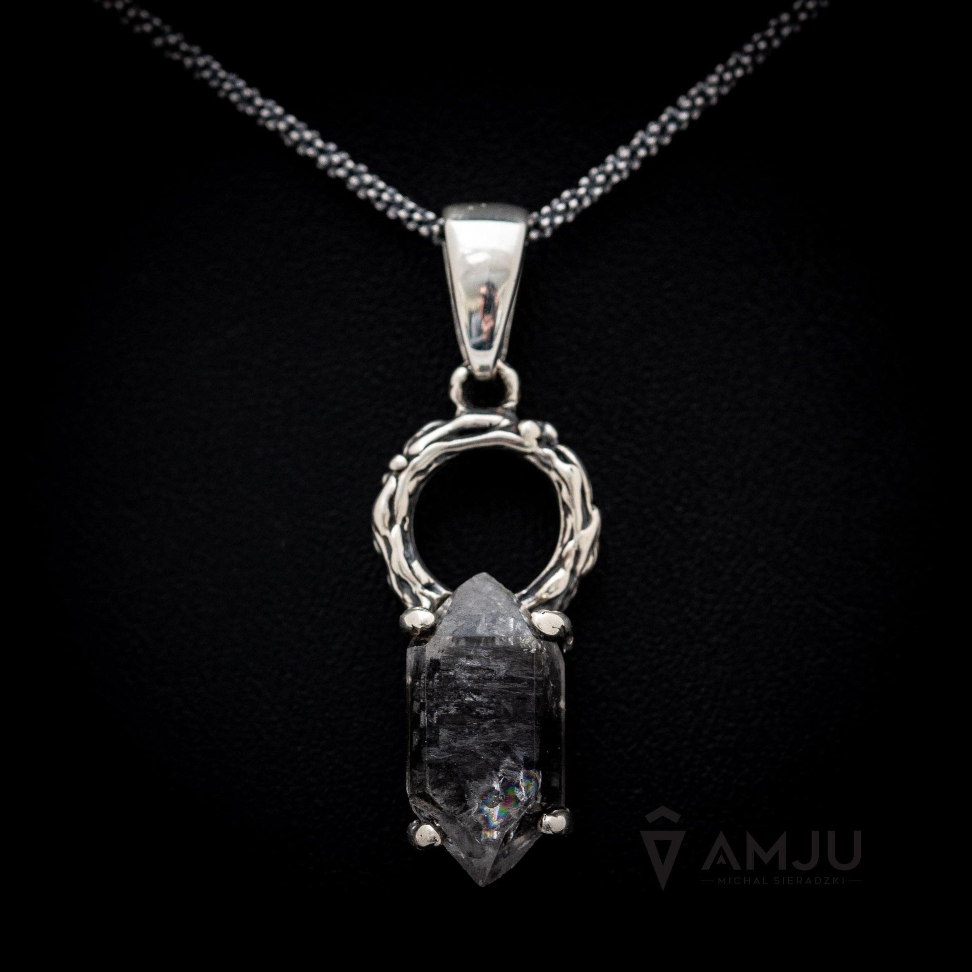A Subtle pendant with Black Rainbow Tibetan Quartz Crystal double terminated a variety of Rock Crystals. This unique gemstone hasn't been polished, its form is fully natural. Inside are embedded little particles of carbon inclusions which make it black. The delicate setting is a 925 sterling silver, oxidated and polished.