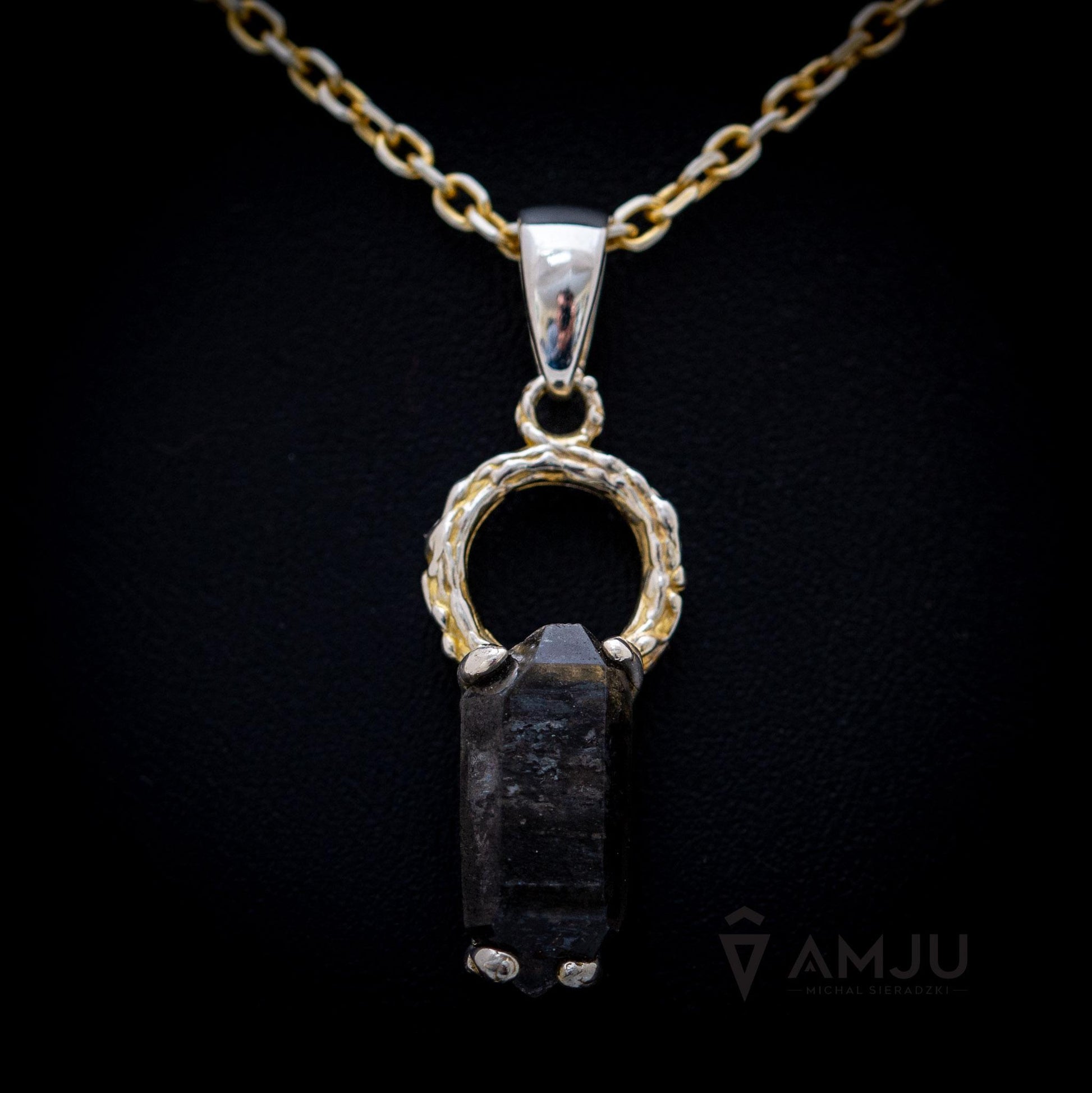 A Subtle pendant with Tibetan Quartz Crystal, a variety of Rock Crystals. This unique gemstone hasn't been polished, its form is fully natural. Inside are embedded little particles of carbon inclusions which make it black. The delicate setting is a 925 sterling silver, partially gold plated and polished.