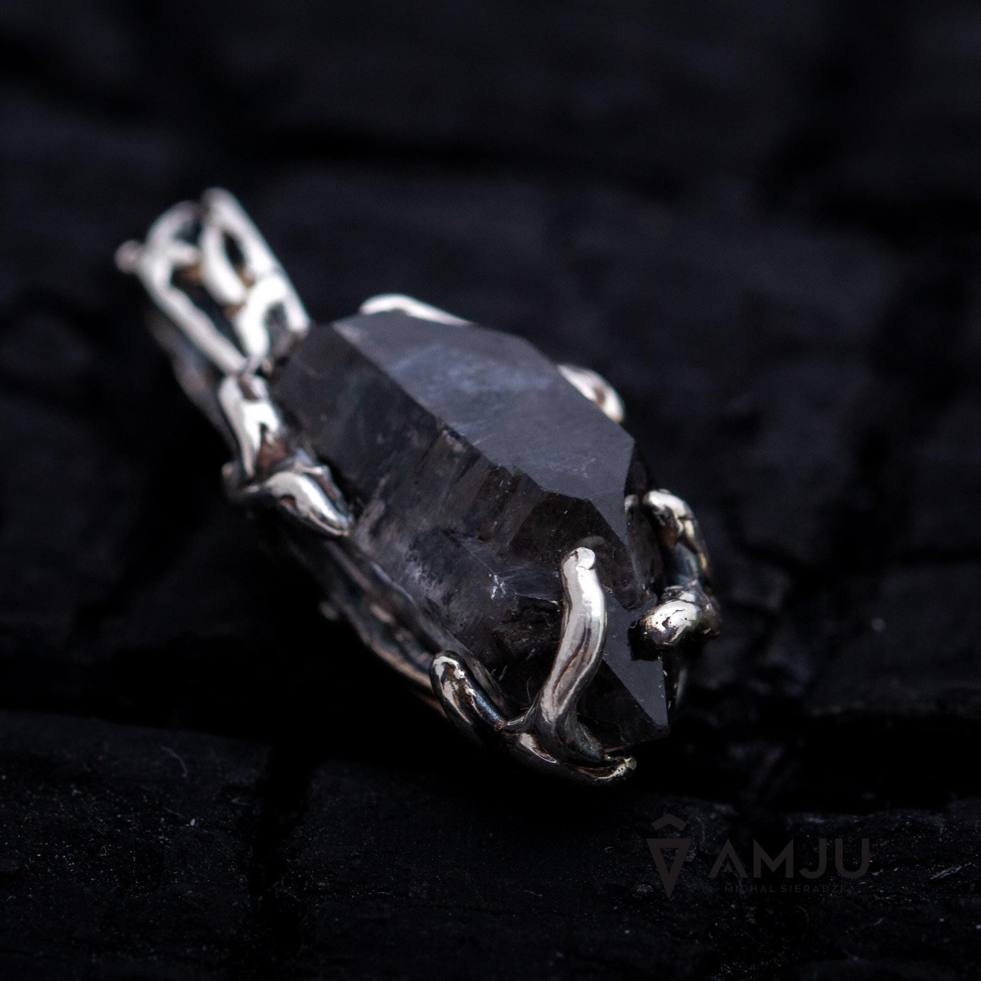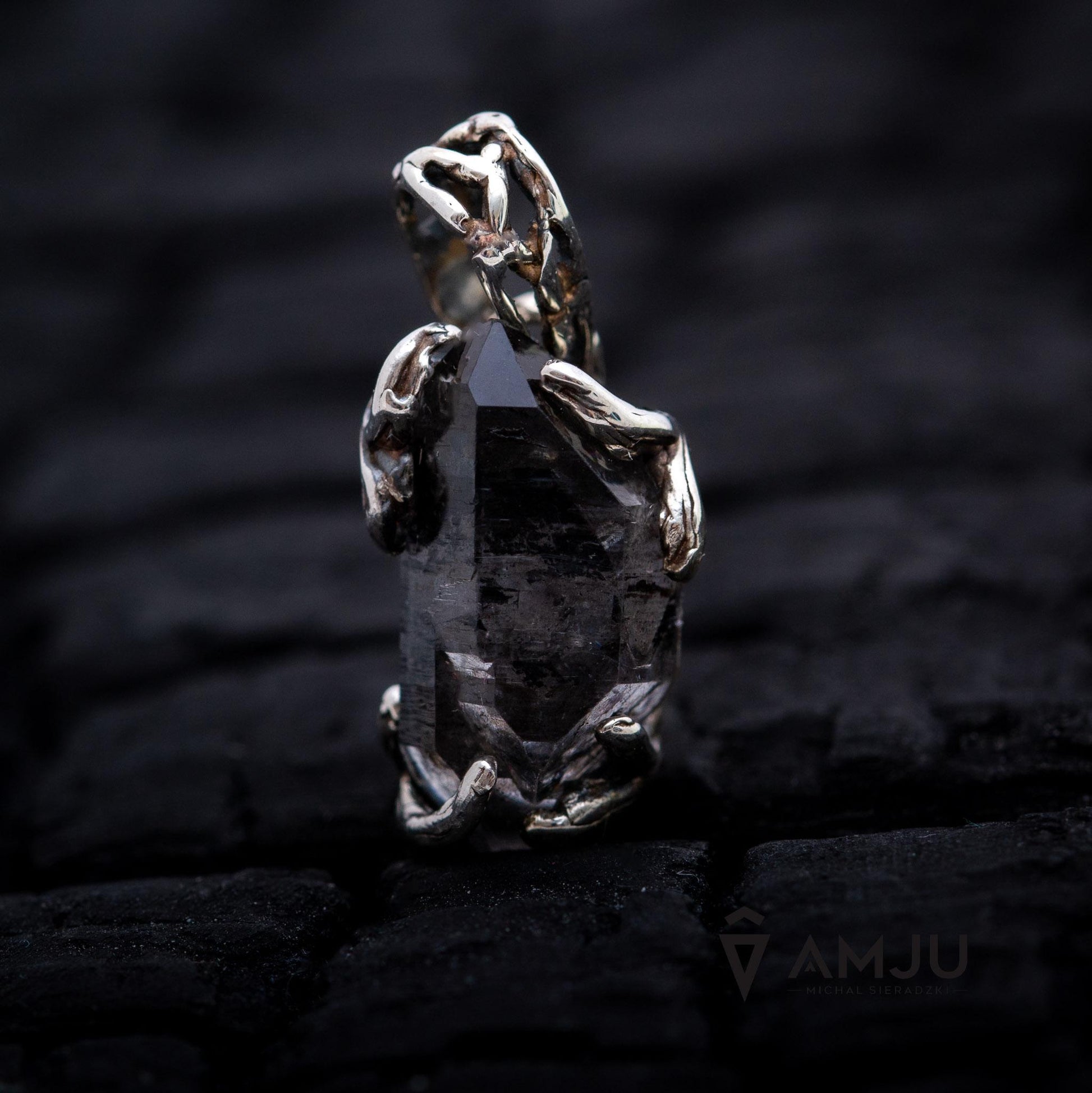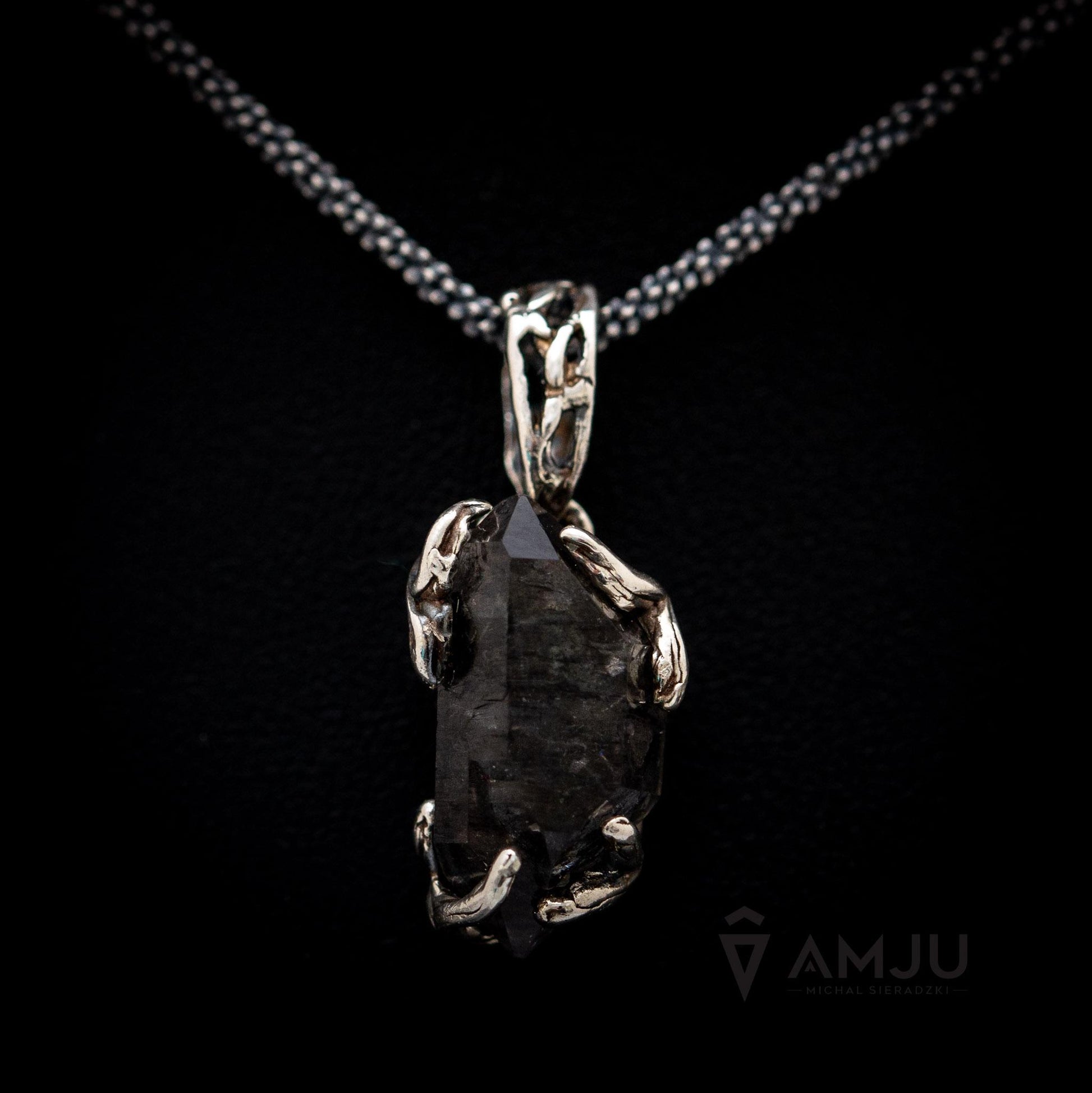 A Subtle pendant with Black Tibetan Quartz Crystal double terminated a variety of Rock Crystals. This unique gemstone hasn't been polished, its form is fully natural. Inside are embedded little particles of carbon inclusions which make it black. The delicate setting is a 925 sterling silver, oxidated and polished.
