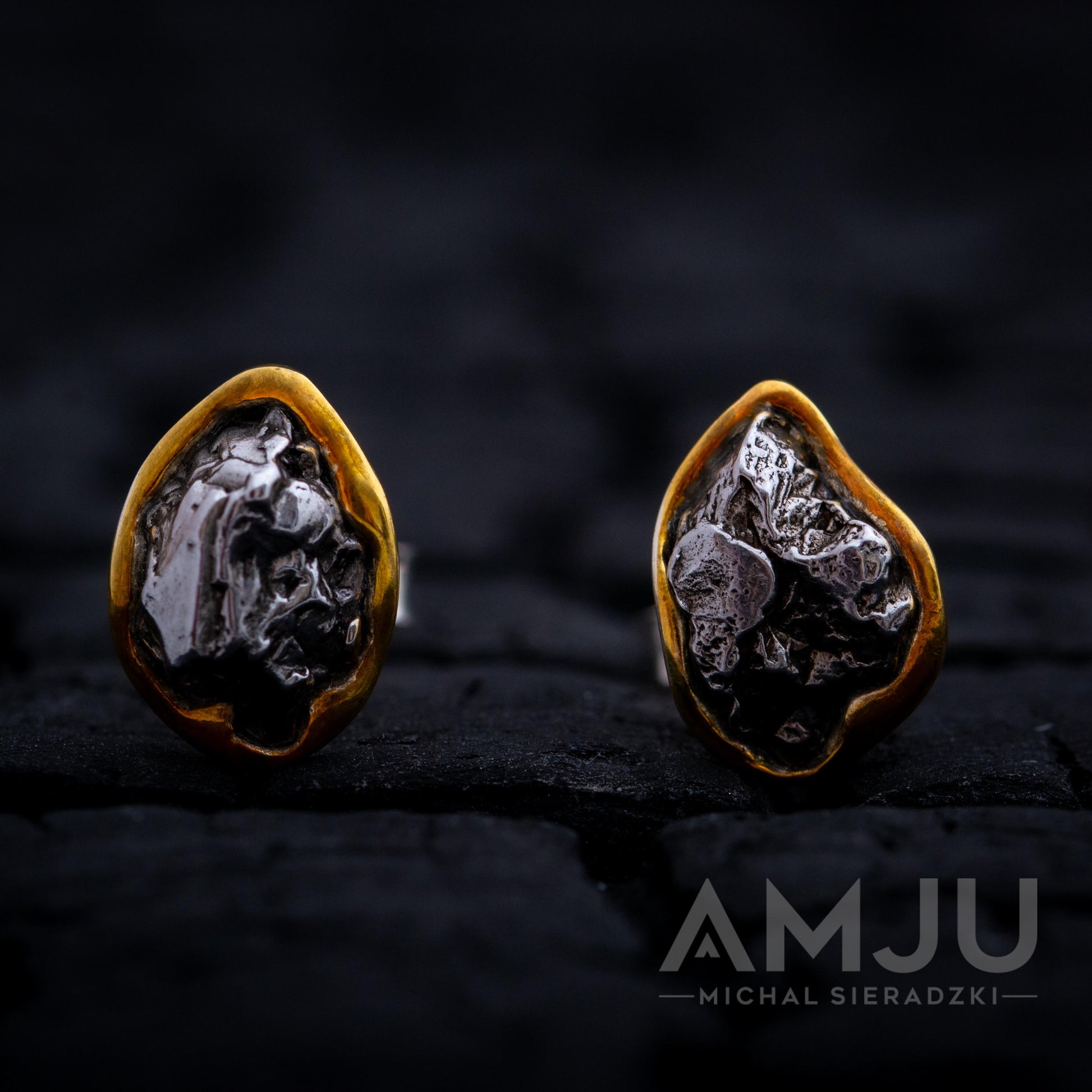 Minimalistic earrings with Campo del Cielo meteorite, framed in sterling silver 925, partially gold plated and polished.
