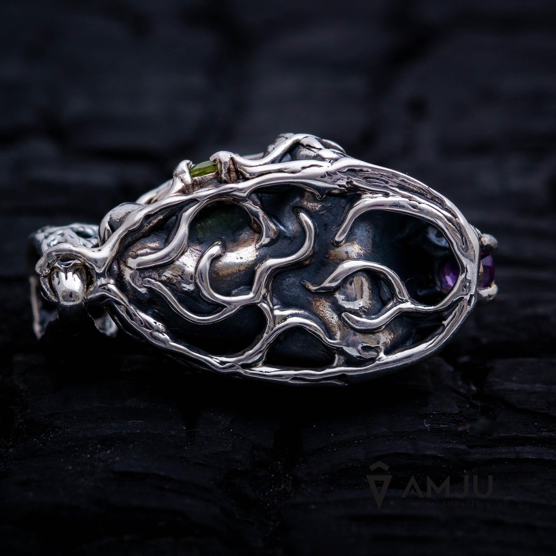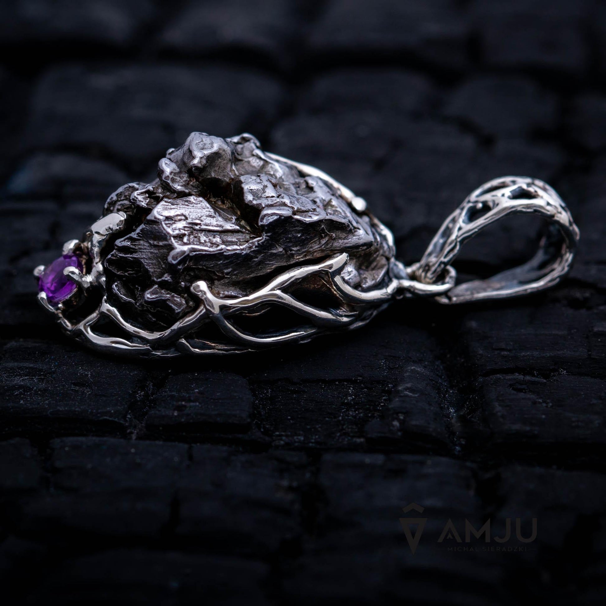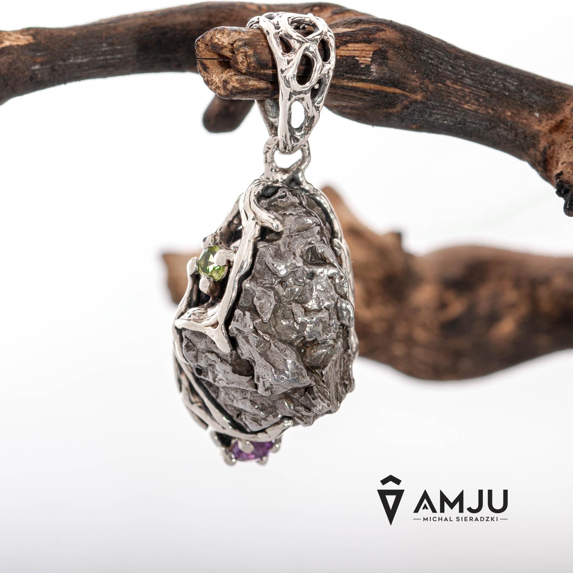 A beautiful pendant with a Campo del Cielo meteorite and accent of a peridot 3mm (olivine) and amethyst 3.5mm. The delicate setting is made of a 925 sterling silver, oxidated and polished.