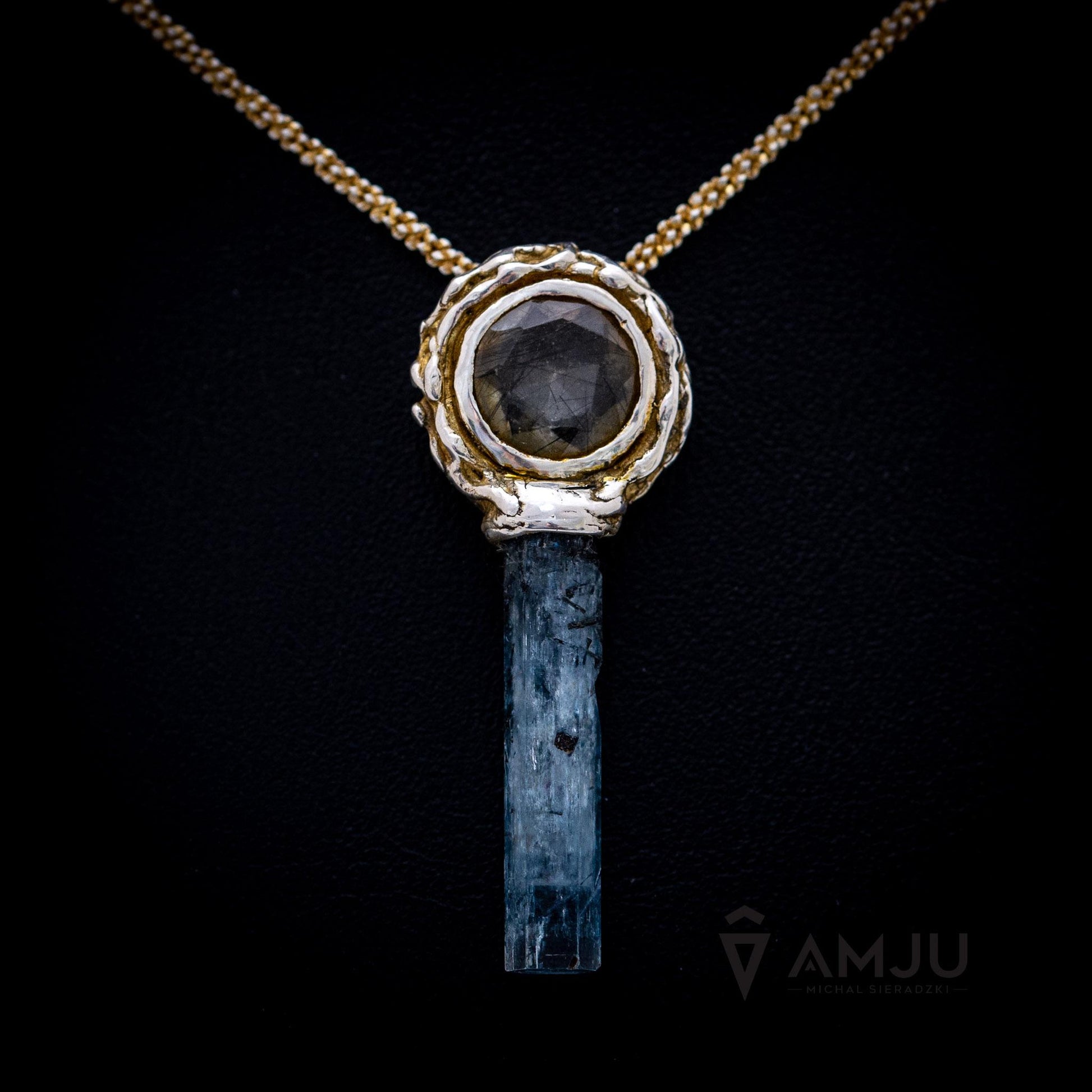 Unique lollipop pendant with aquamarine with black tourmaline schorl and rutilated quartz, made out of sterling silver 925, partially goldplated and polished.