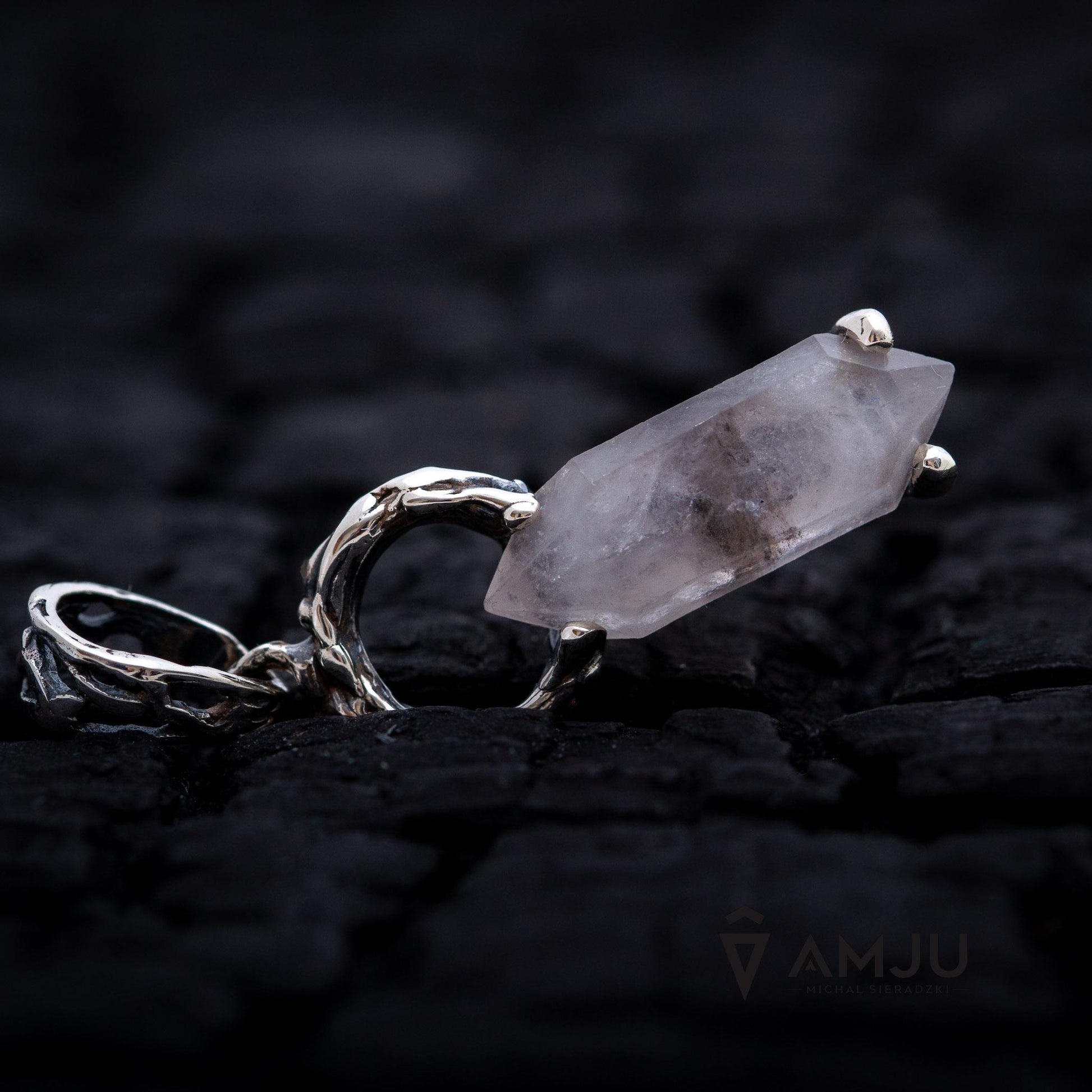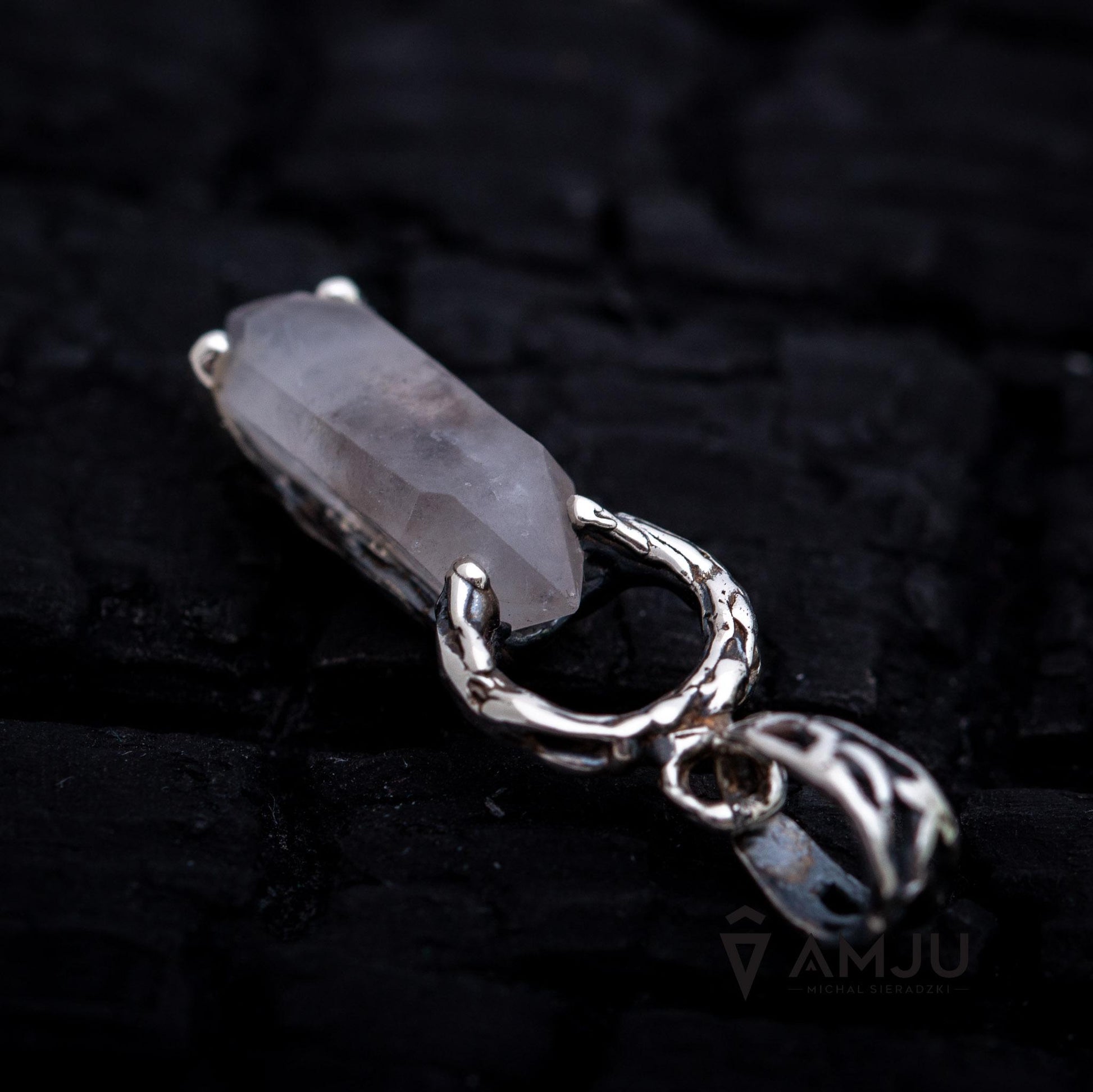 A Subtle pendant with Milk Tibetan Quartz Crystal double terminated a variety of Rock Crystals. This unique gemstone hasn't been polished, its form is fully natural. Inside are embedded little particles of carbon inclusions. The delicate setting is a 925 sterling silver, oxidated, and polished.