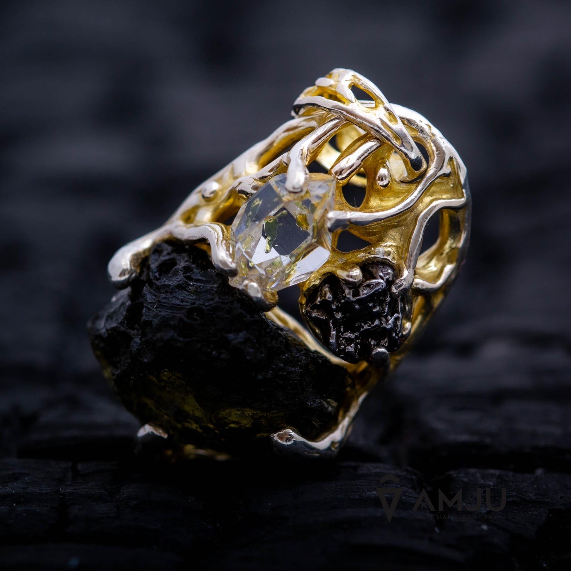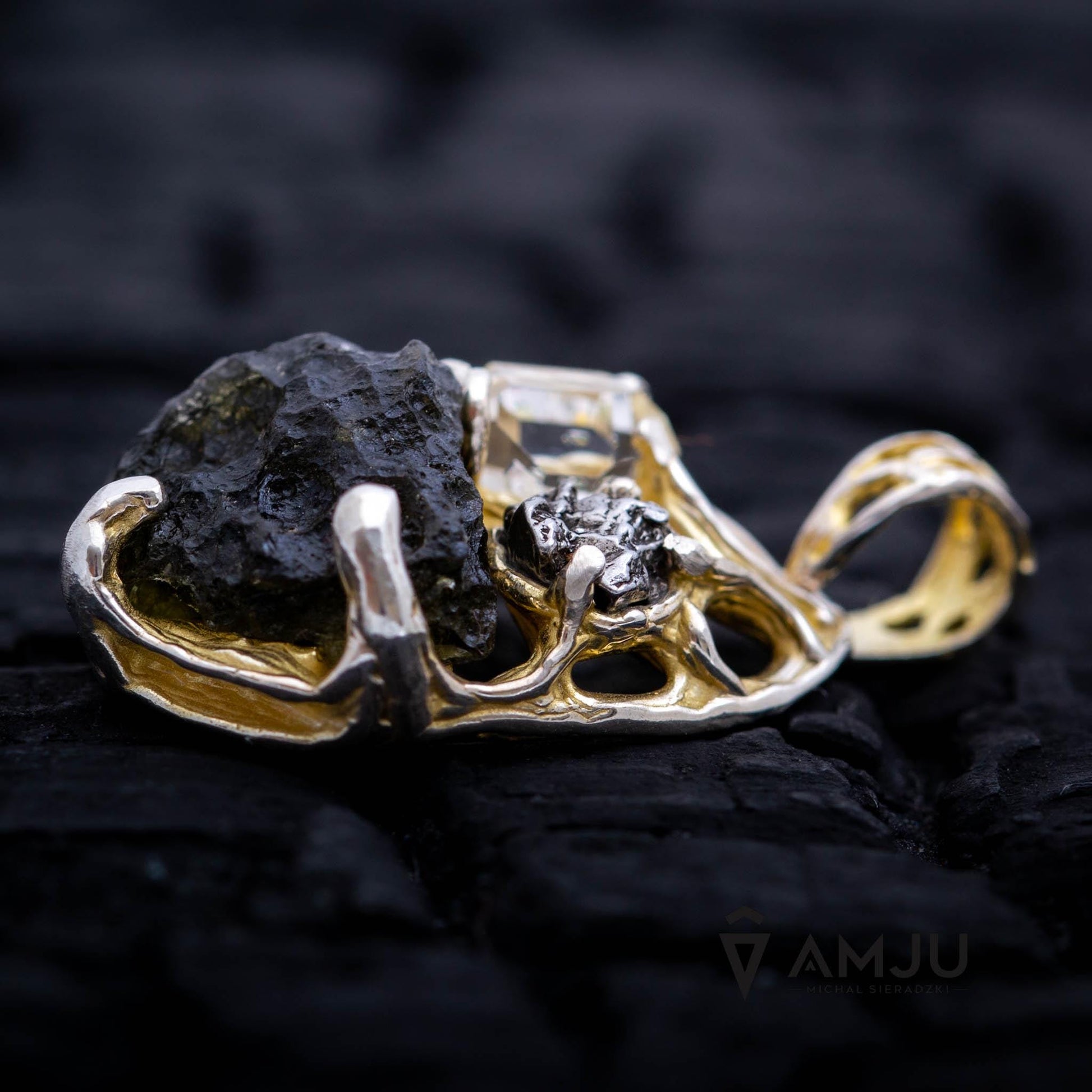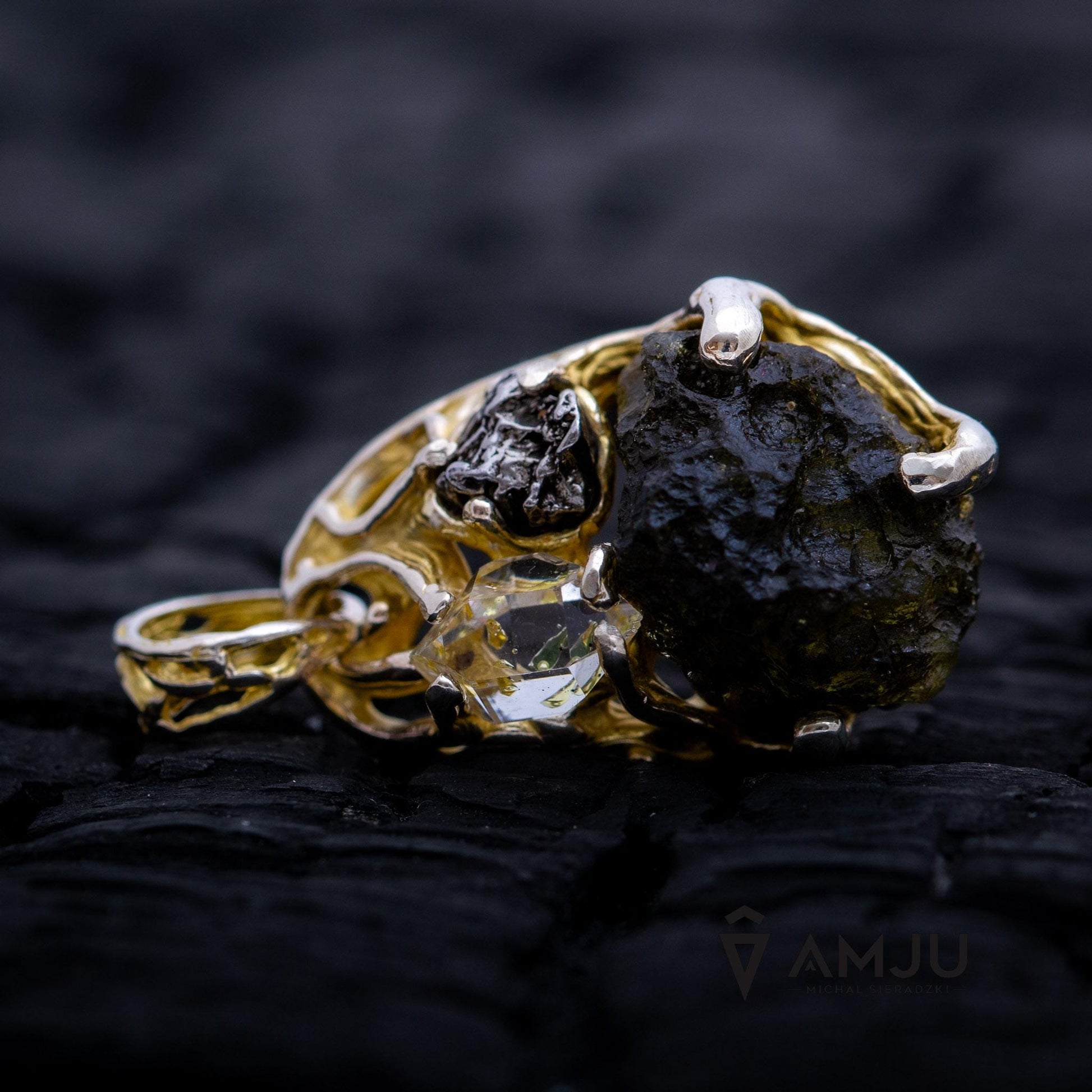 A beautiful pendant with a moldavite and Campo del cielo meteorite with Herkimer Diamond. The delicate setting is made of a 925 sterling silver, gold plated and polished.
