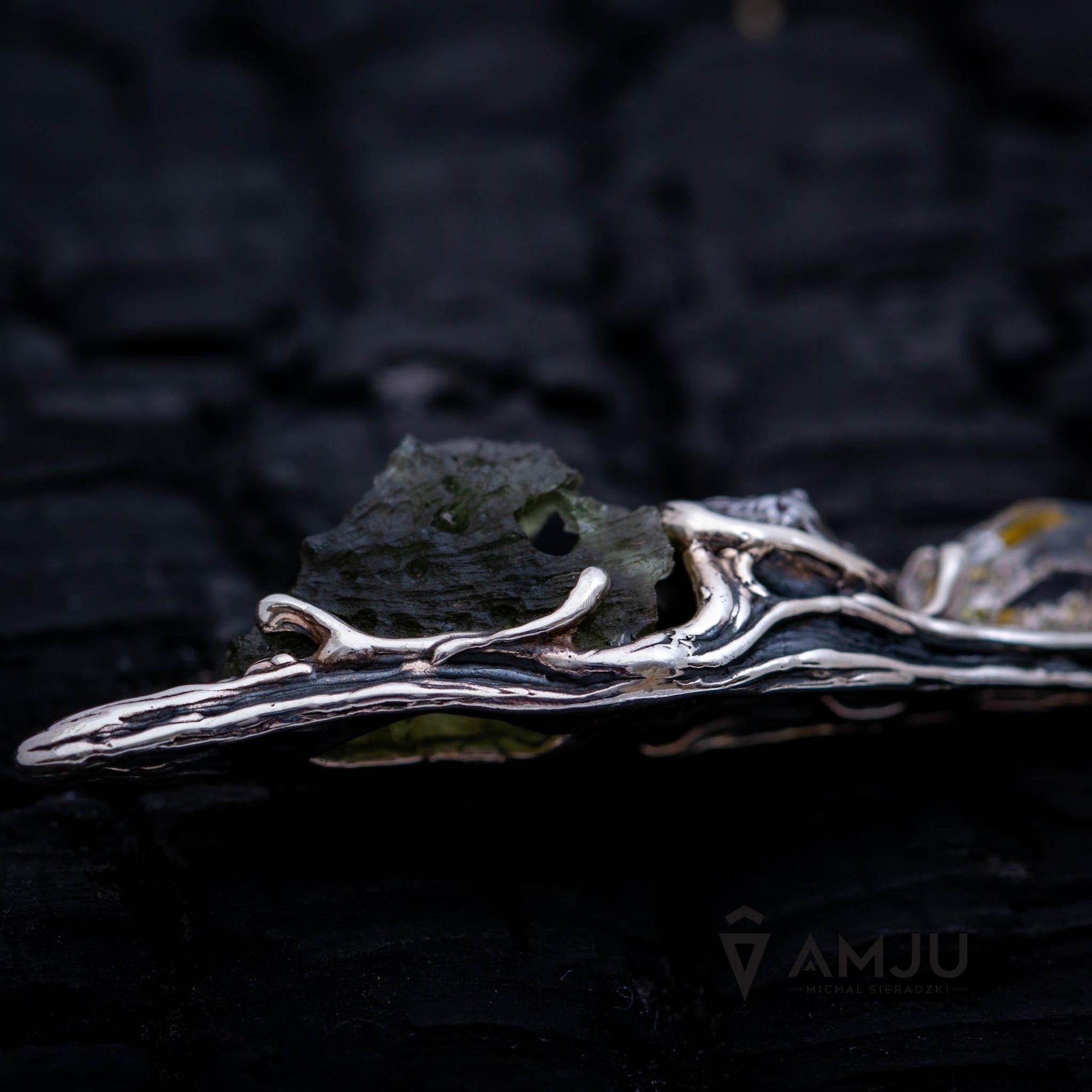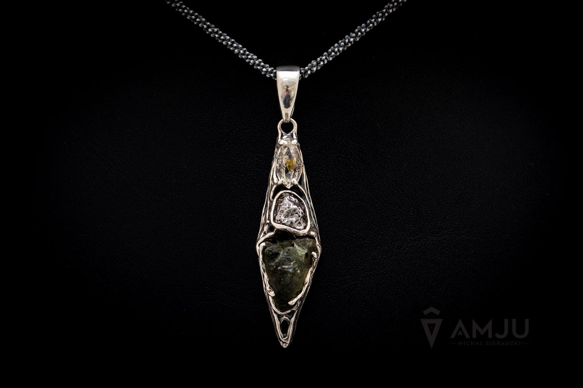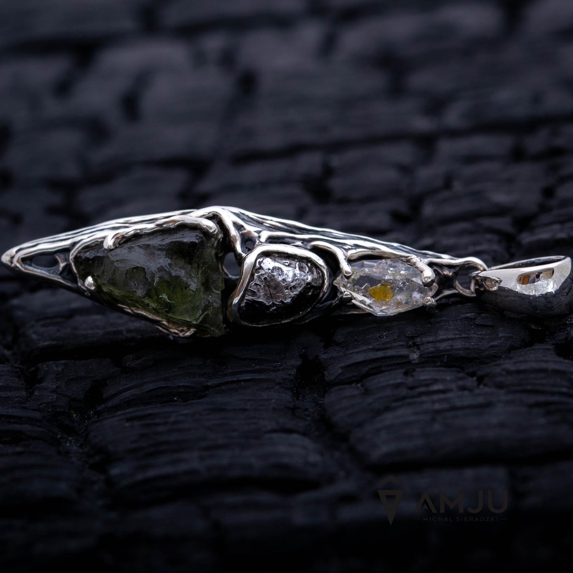 This pendant features a unique design made from moldavite and Campo del Cielo meteorite with Herkimer Diamond. The delicate setting is crafted from oxidized 925 sterling silver and polished.