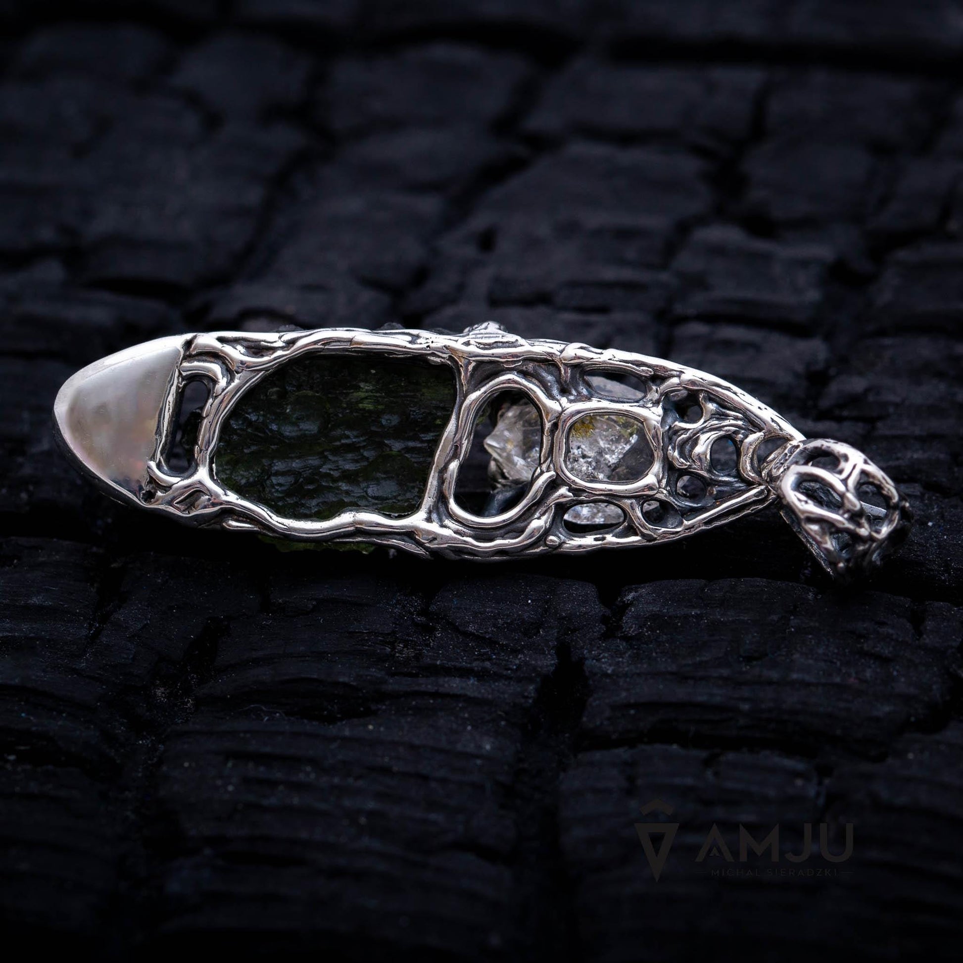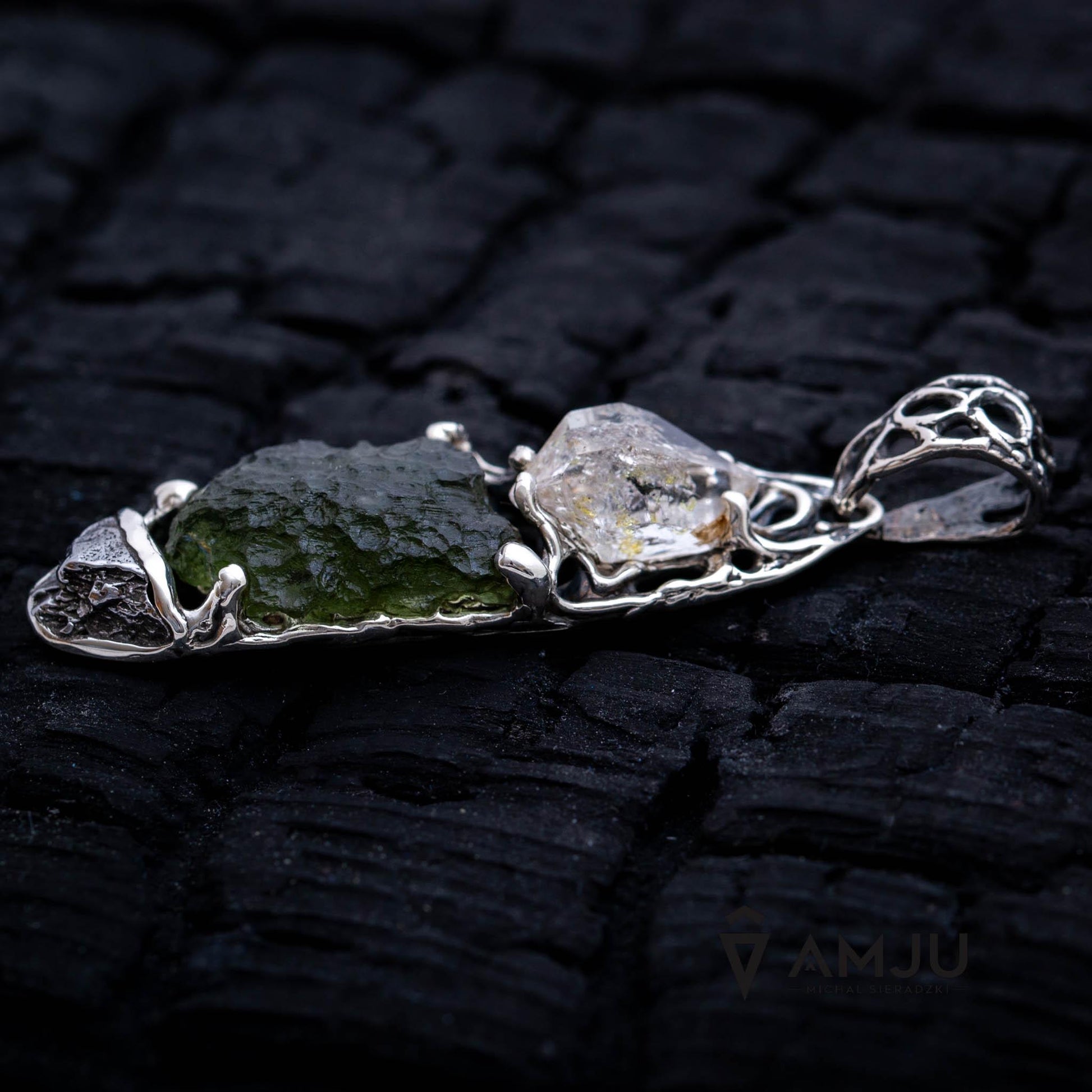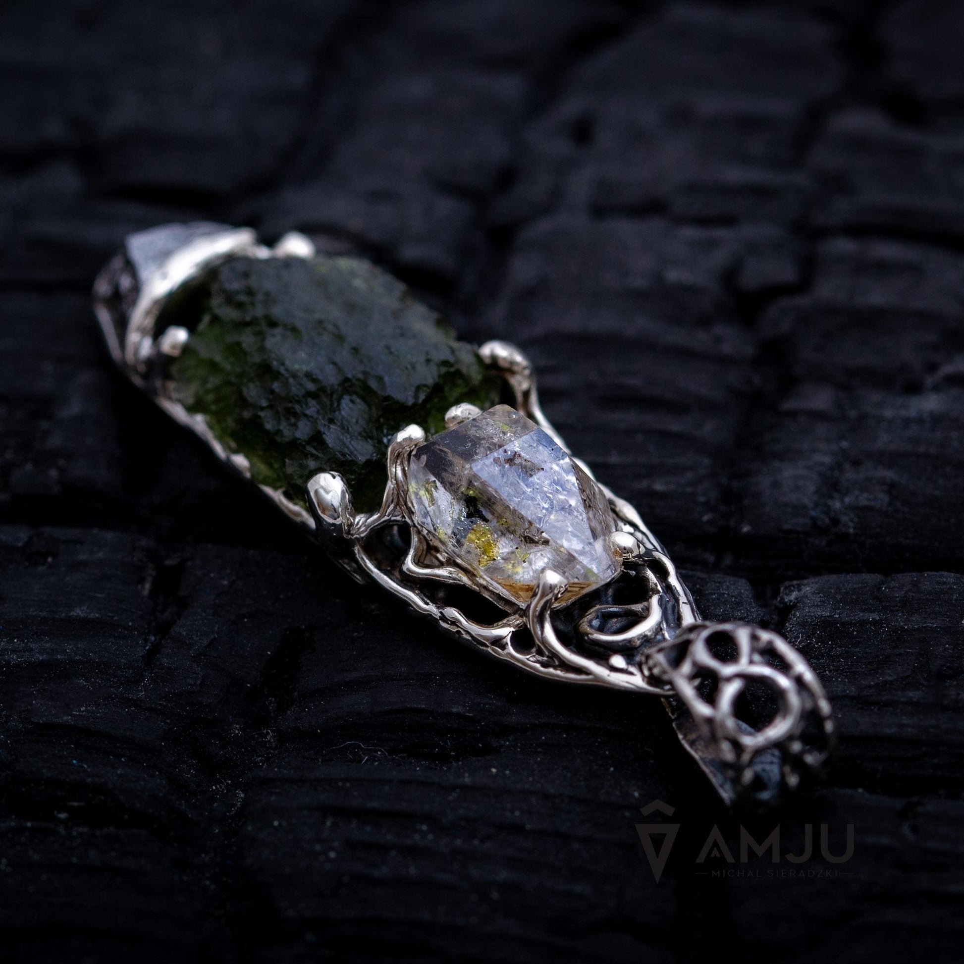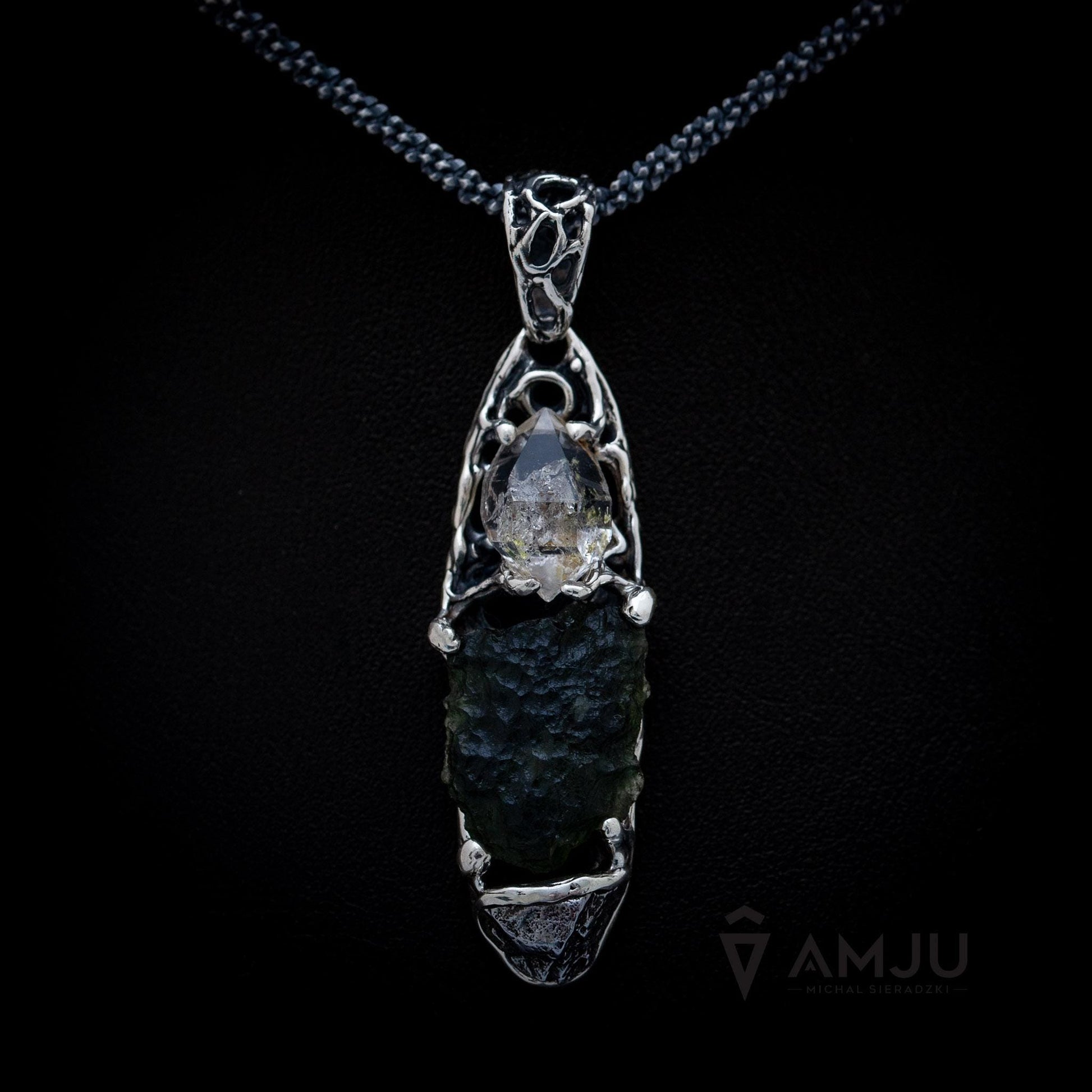 This pendant features a unique design made from moldavite and Campo del Cielo meteorite with Herkimer Diamond. The delicate setting is crafted from oxidized 925 sterling silver and polished.