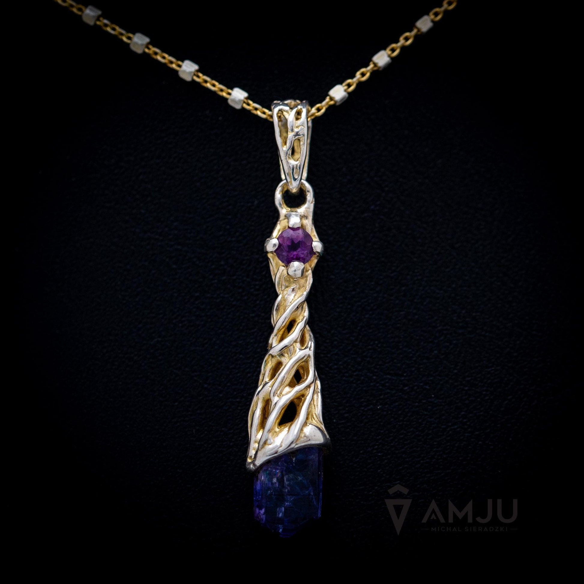 A beautiful pendant with the raw crystal of Tanzanite and two round cut Amethyste.