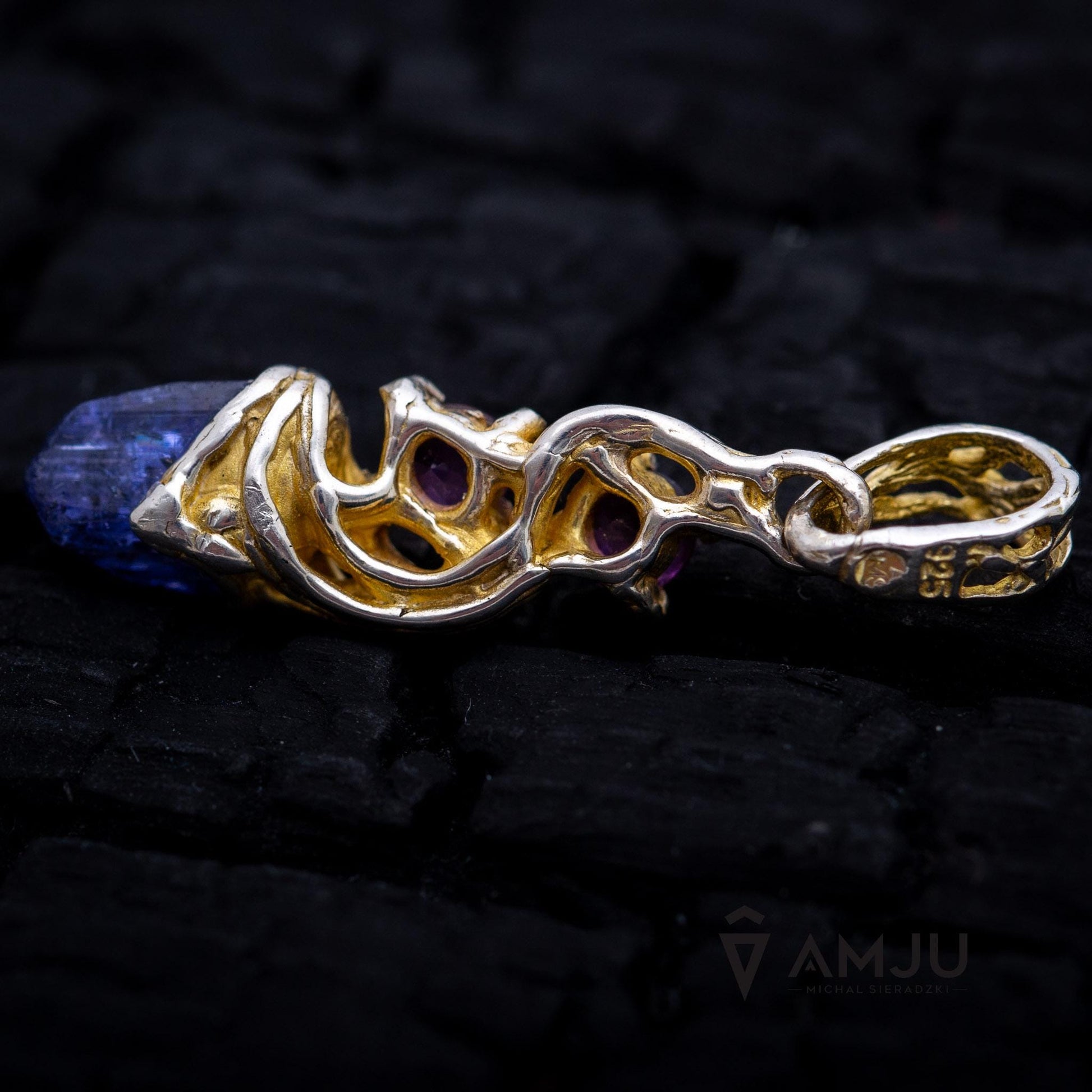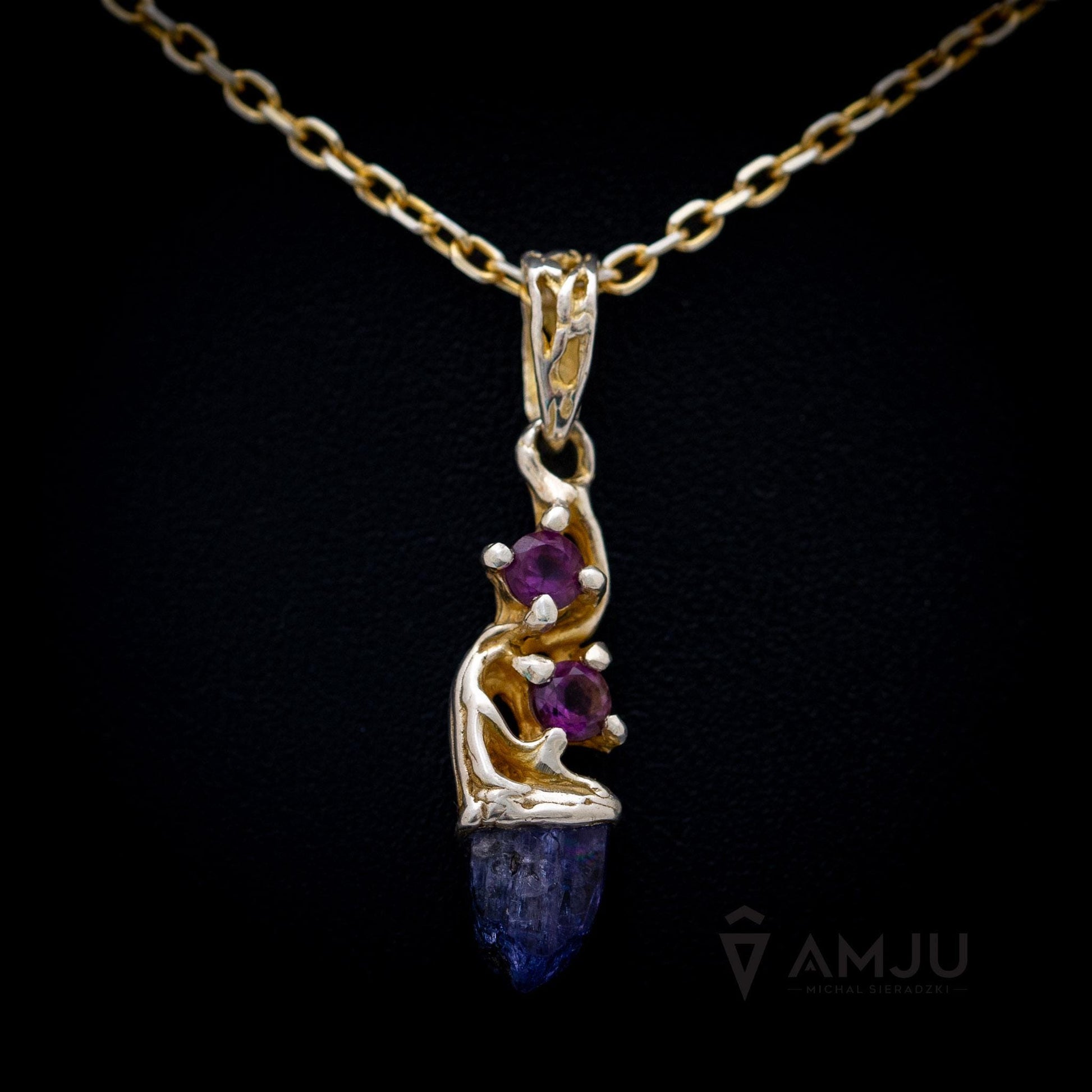 A beautiful pendant with the raw crystal of Tanzanite and two round cut Amethyste.