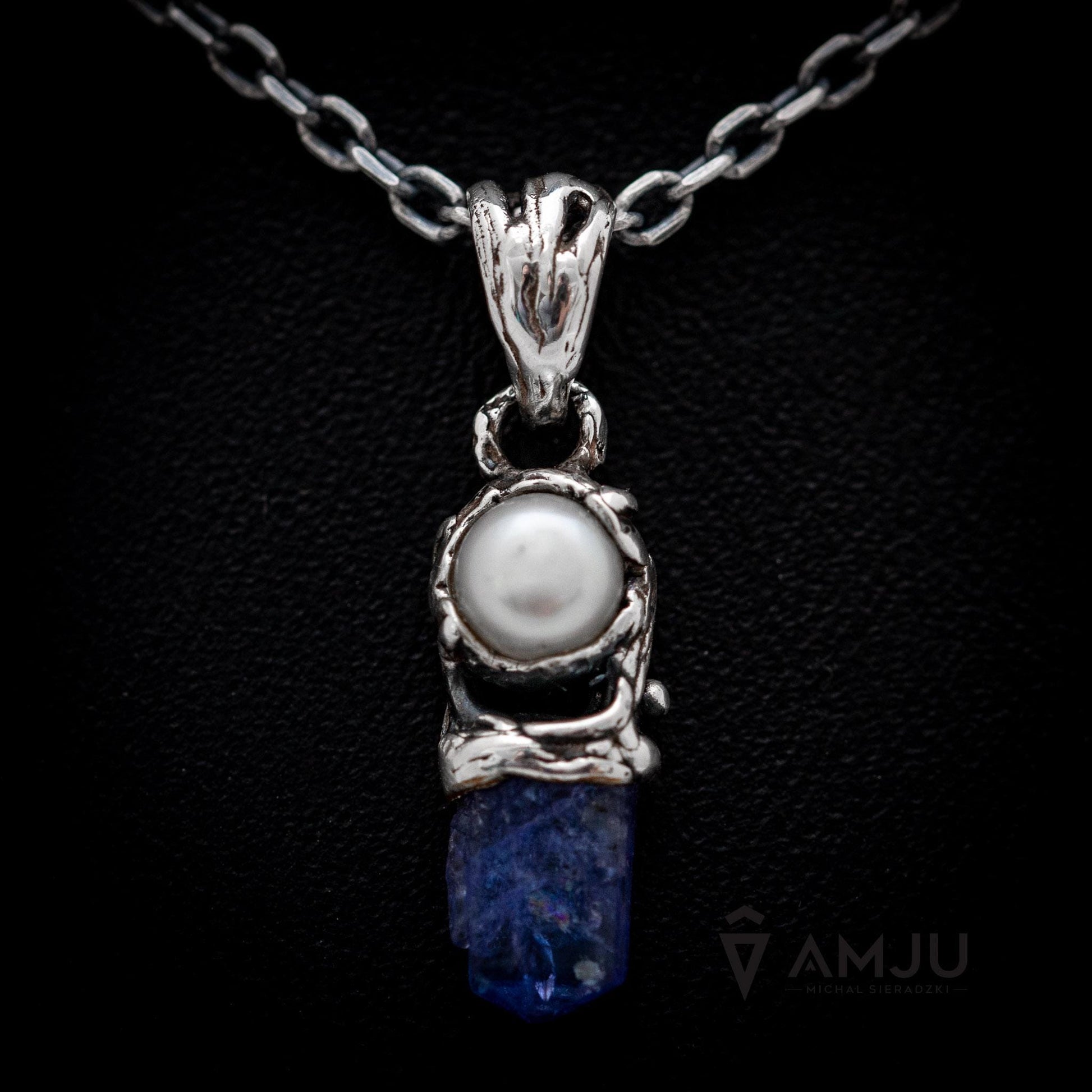 A beautiful pendant with raw Tanzanite crystal with a freshwater pearl.