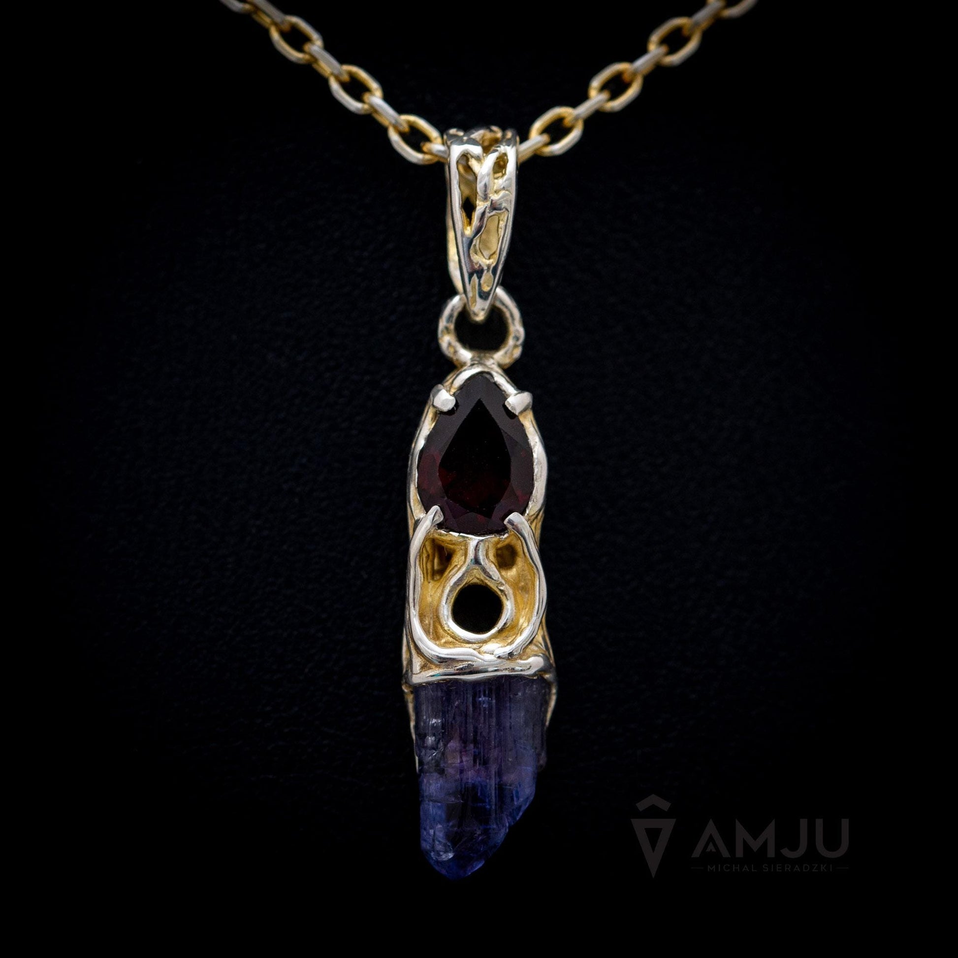 A beautiful pendant with the raw crystal of Tanzanite and pear-cut Garnet.