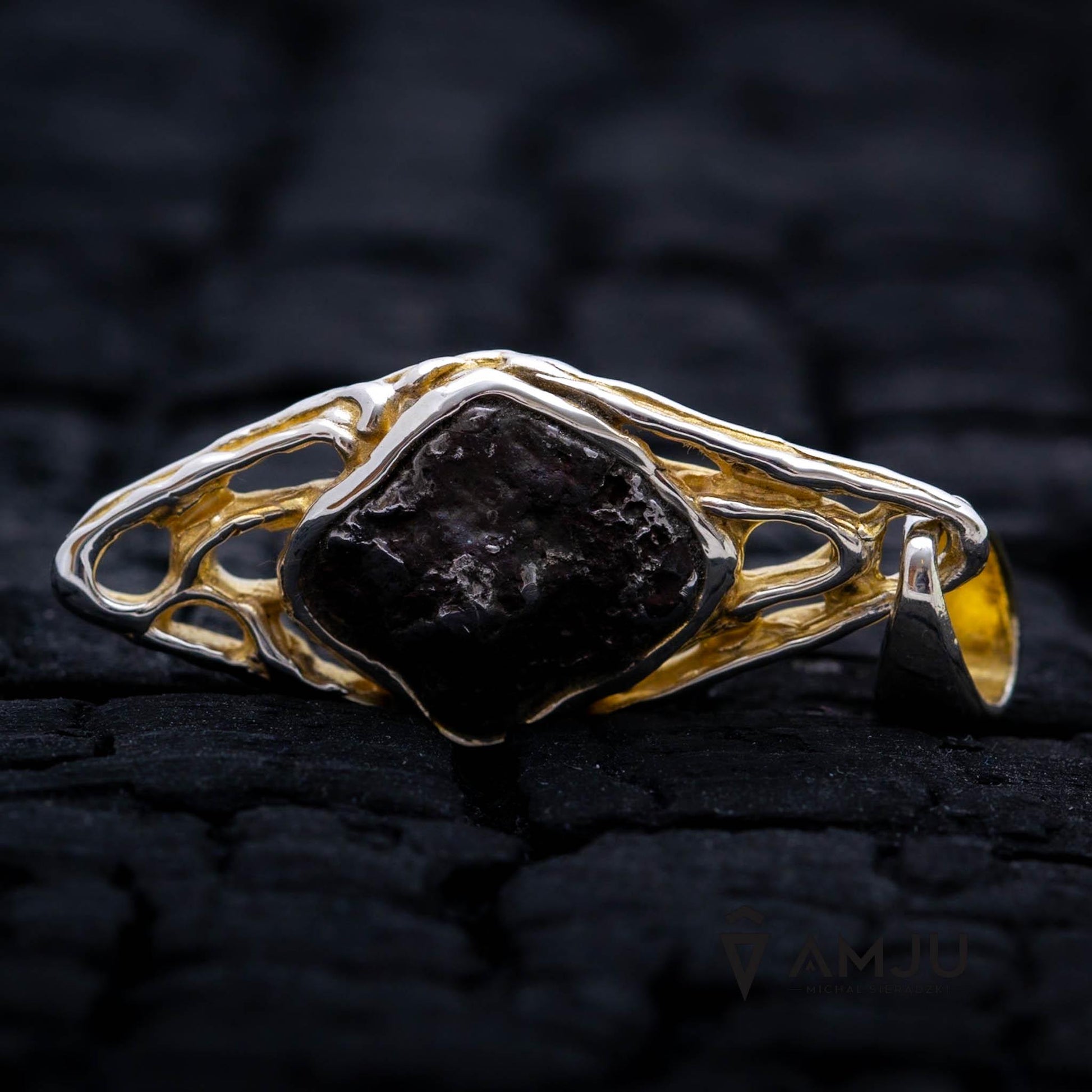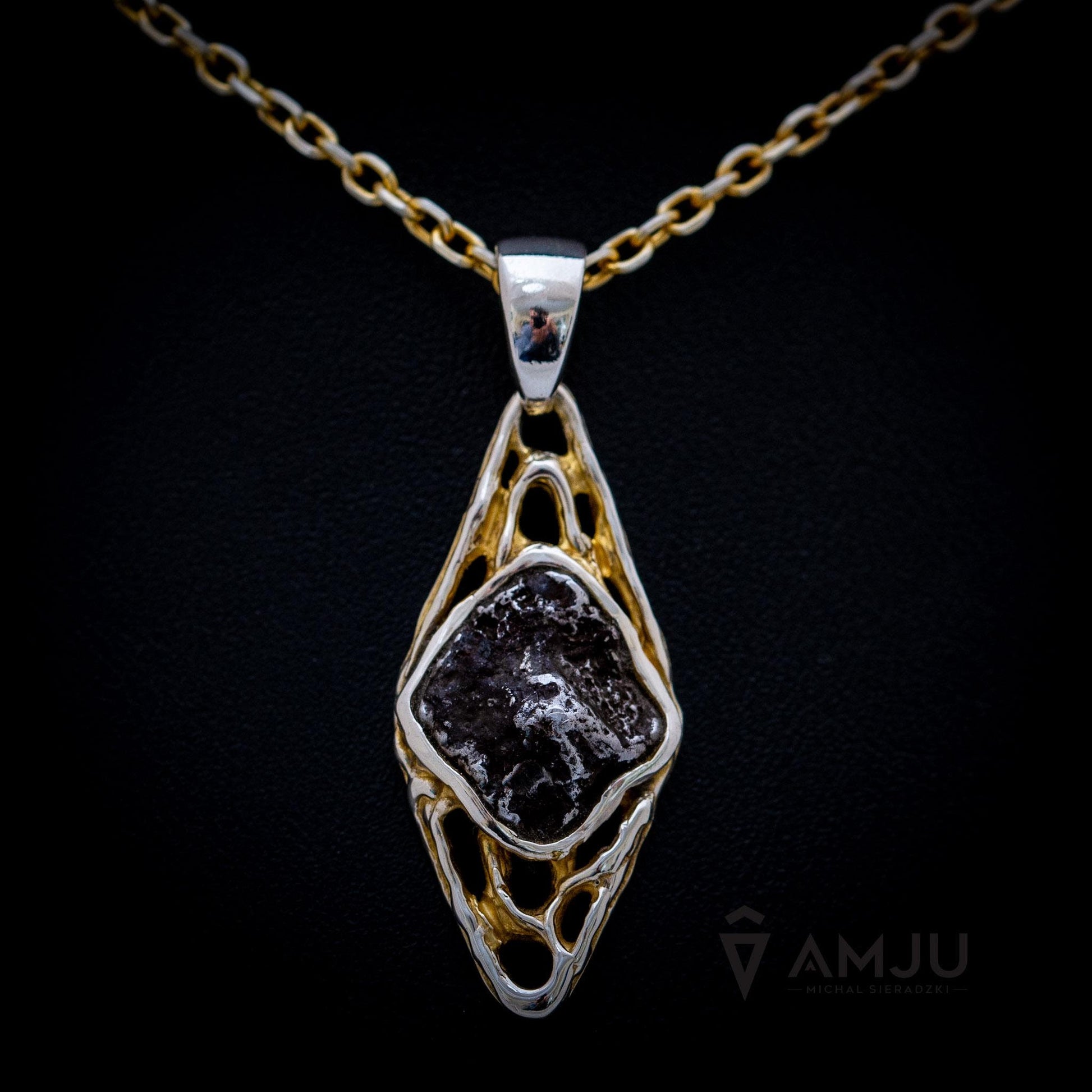 This is a beautiful pendant with a Sikhote Alin meteorite. The delicate setting is made of 925 sterling silver, gold-plated, and polished.