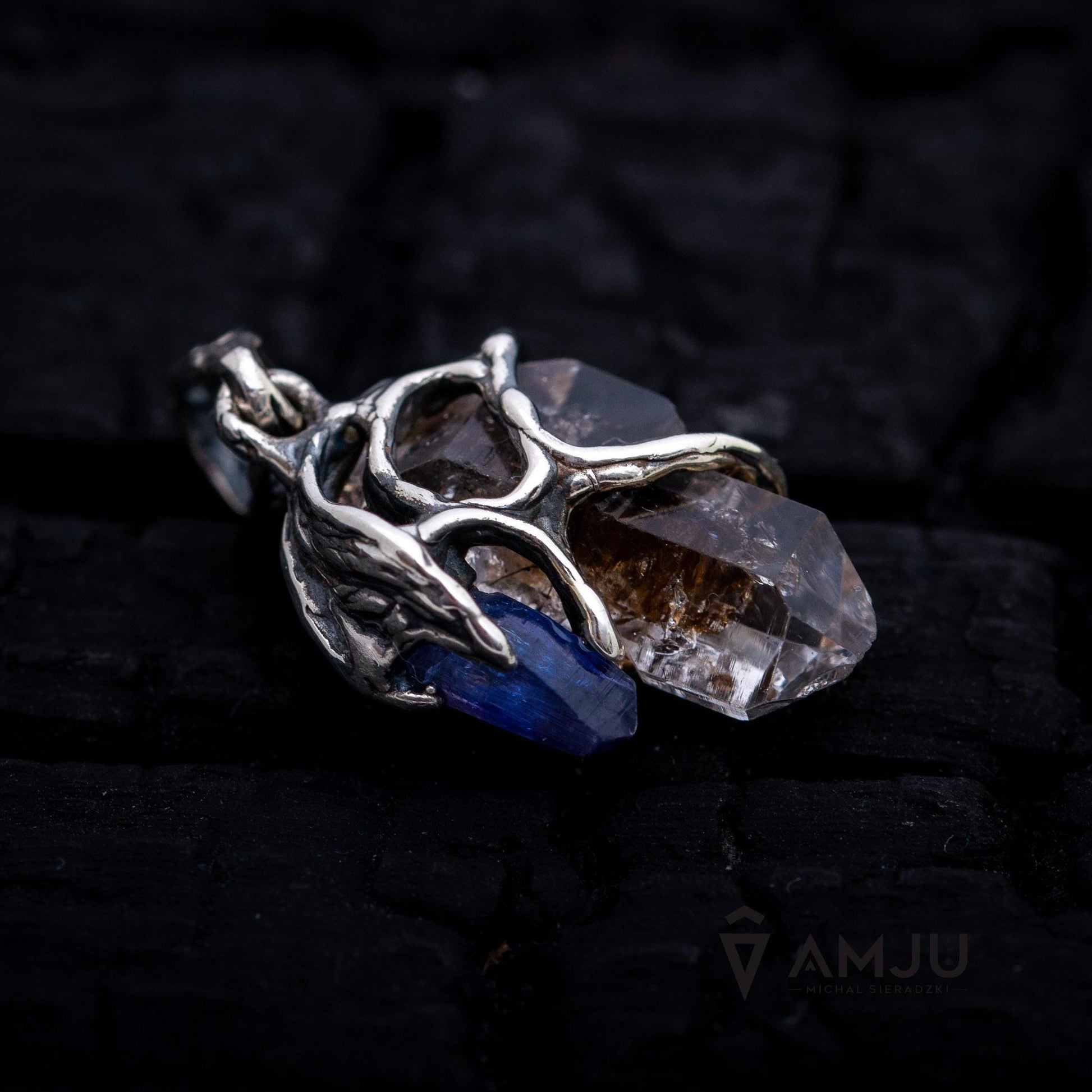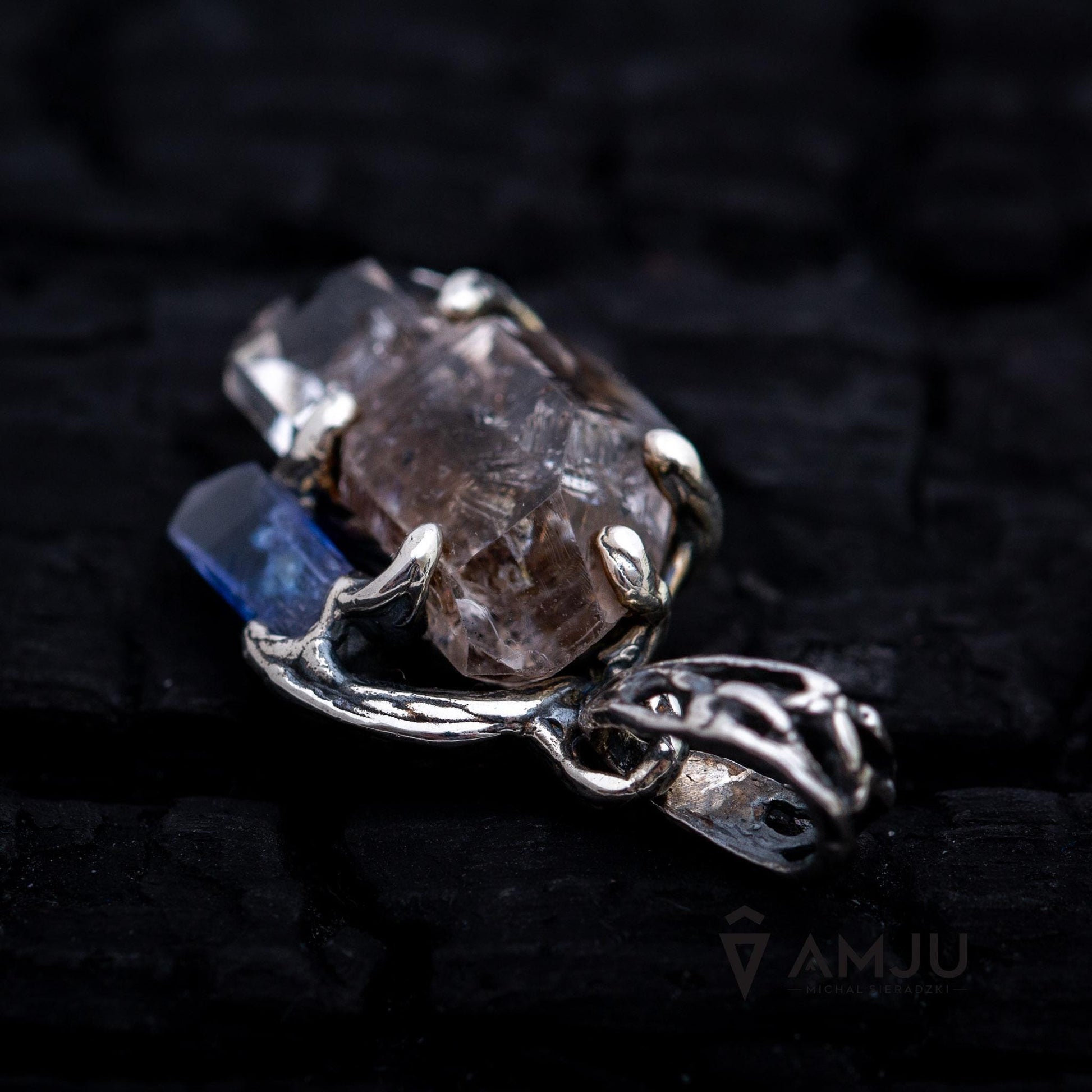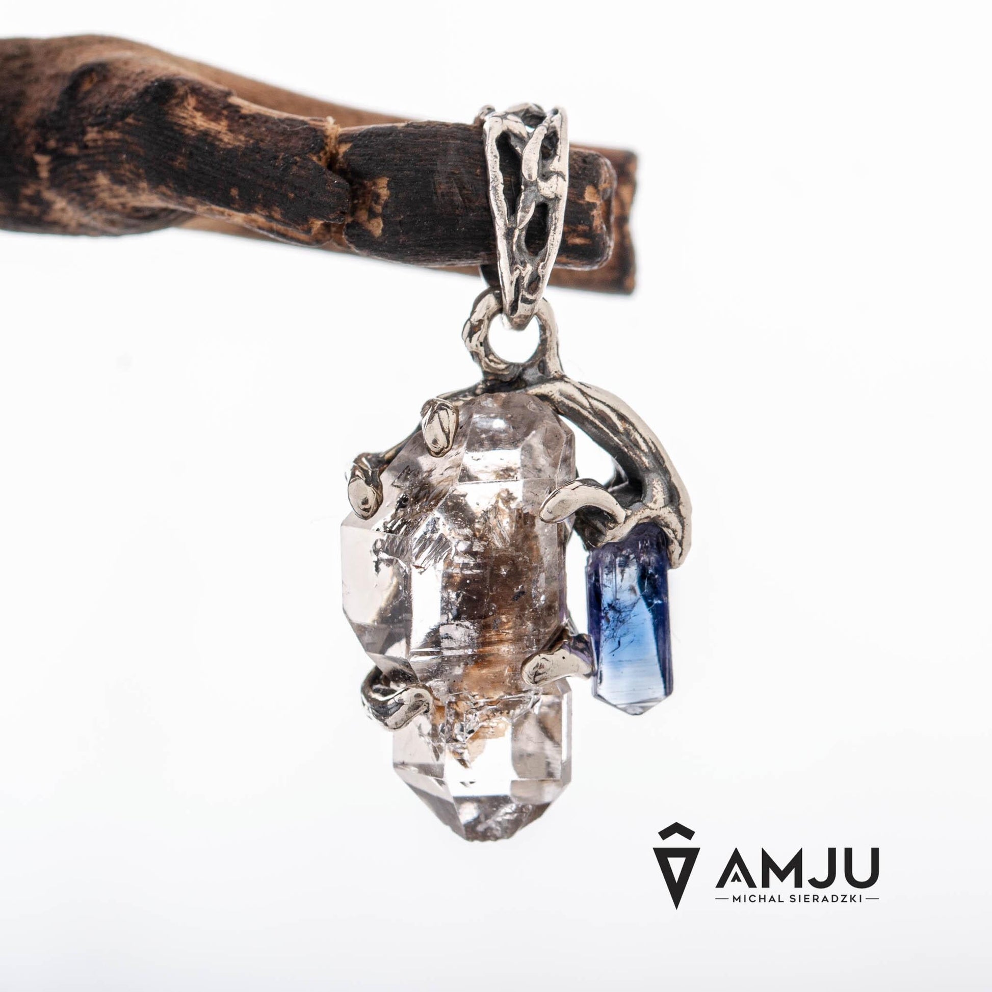 A Subtle pendant with Tibetan Quartz Crystal and Tanzanite crystal. This unique gemstone hasn't been polished, its form is fully natural. Inside are embedded little particles of carbon. The delicate setting is a 925 sterling silver, oxidated and polished.