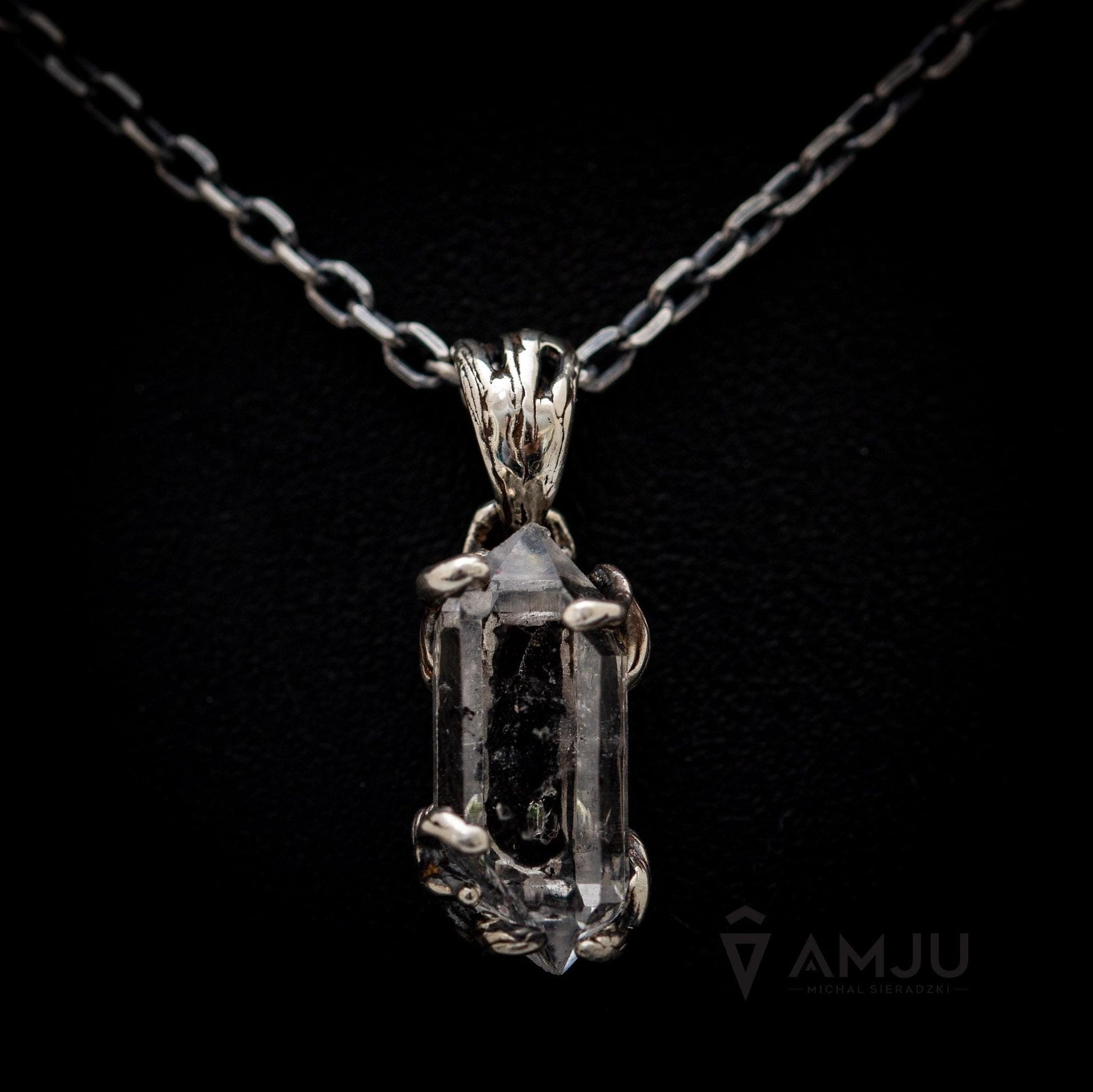 This unique gemstone hasn't been polished, its form is fully natural. Inside are embedded central situated particles of carbon and petroleum that glow in UV light. The delicate setting is a 925 sterling silver, oxidated and polished.