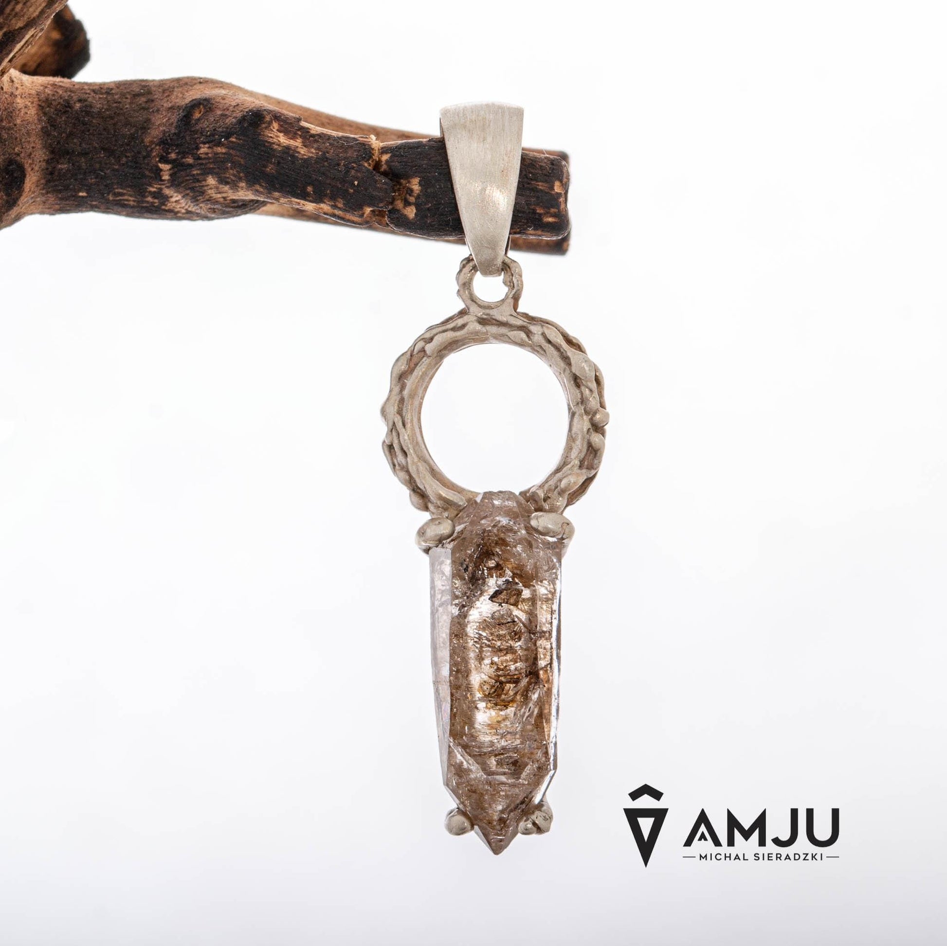 A Subtle pendant with Tibetan Quartz Crystal double terminated a variety of Rock Crystals. This unique gemstone hasn't been polished, its form is fully natural. Inside are embedded little particles of carbon and petroleum that glow in UV light. The delicate setting is a 925 sterling silver, partially rose gold plated, and matte finish.