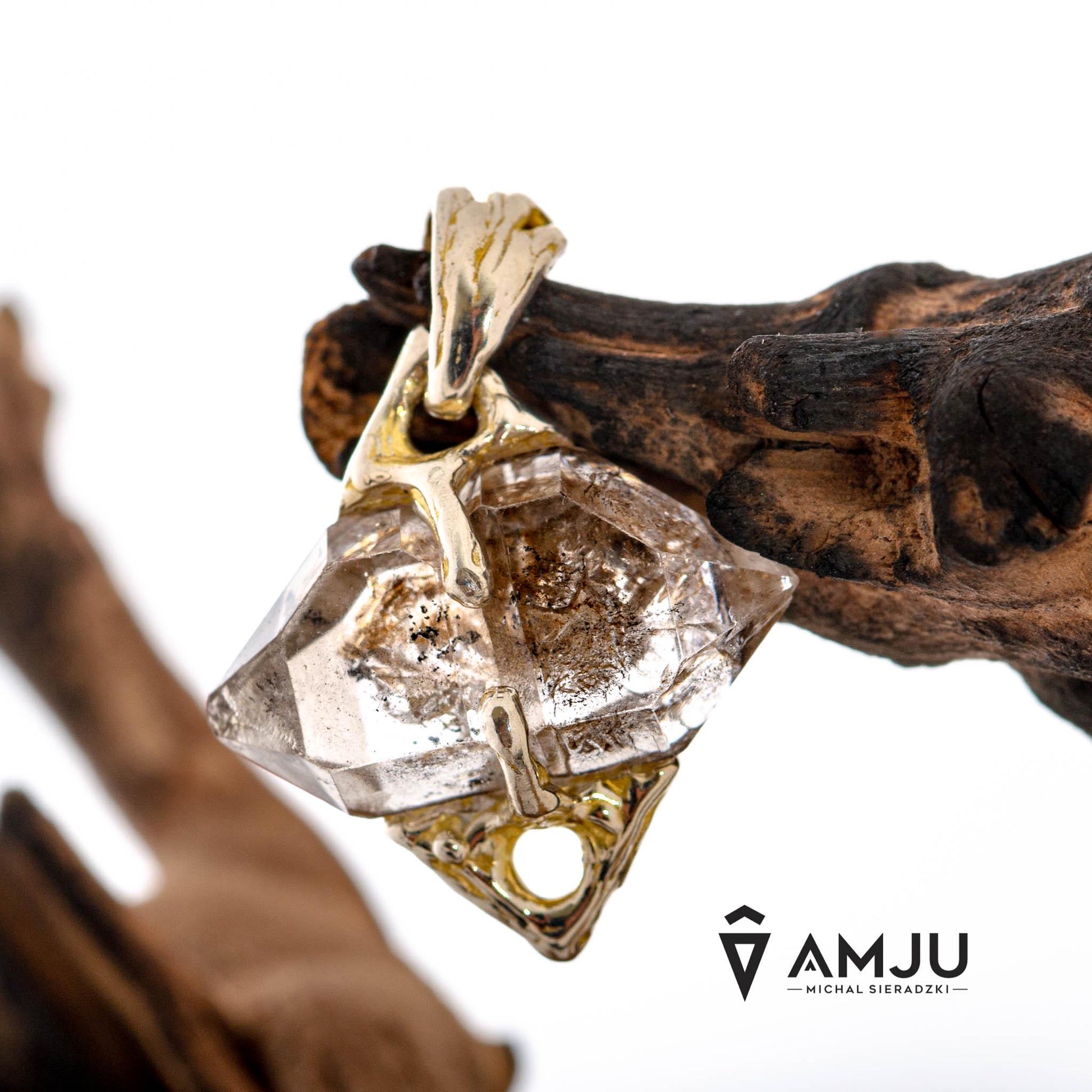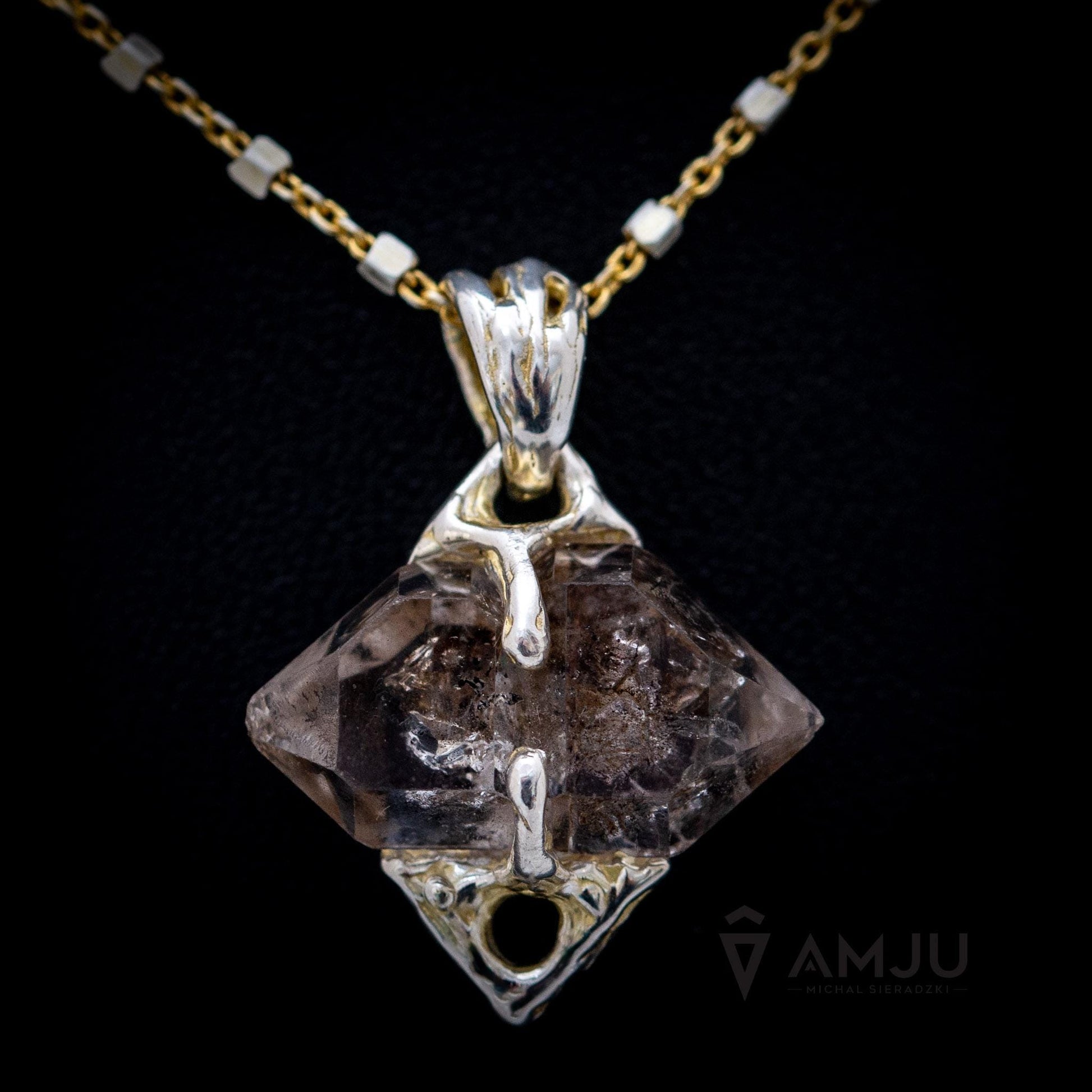 A Subtle square pendant with Tibetan Quartz Crystal, a variety of Rock Crystals. This unique gemstone hasn't been polished, its form is fully natural. Inside are embedded little particles of carbon. The delicate setting is a 925 sterling silver, partially gold plated and polished.