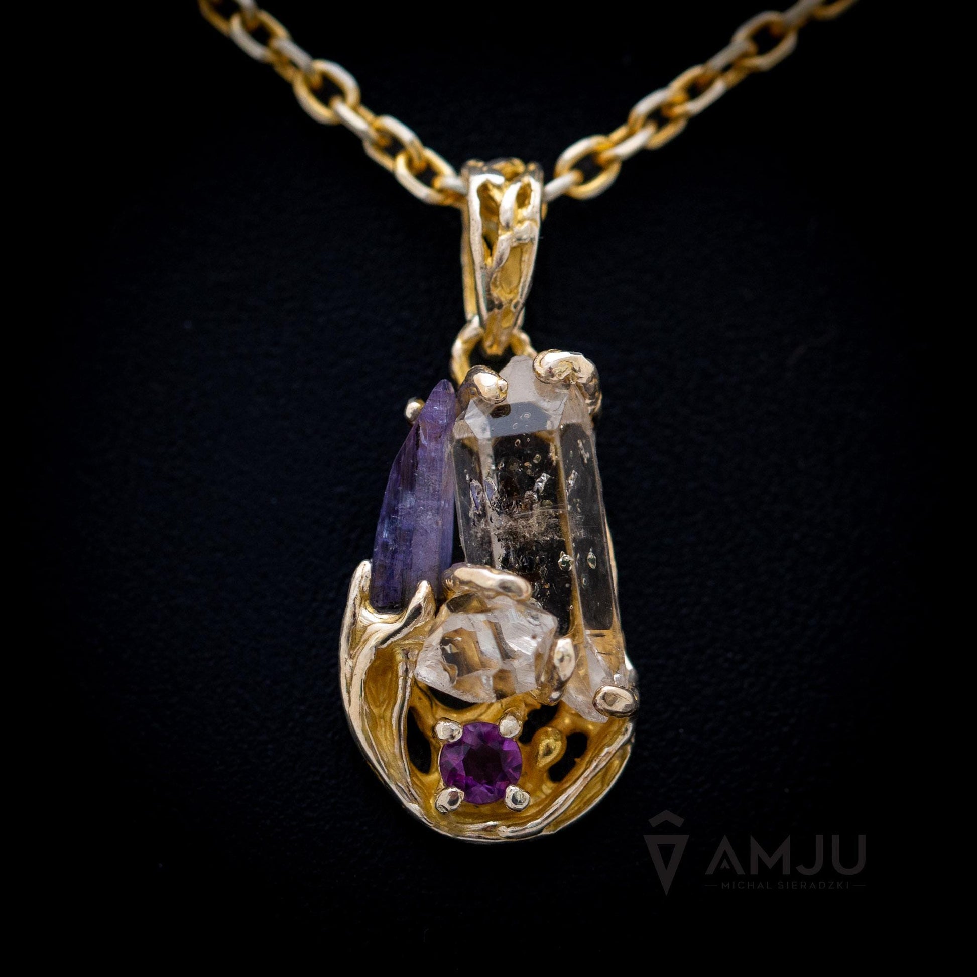A Subtle pendant with Tibetan Quartz Crystal, raw Tanzanite crystal, and small amethyst. This unique gemstone hasn't been polished, its form is fully natural. Inside are embedded little particles of carbon and petroleum that glow in UV light. The delicate setting is a 925 sterling silver, partially gold plated and polished.