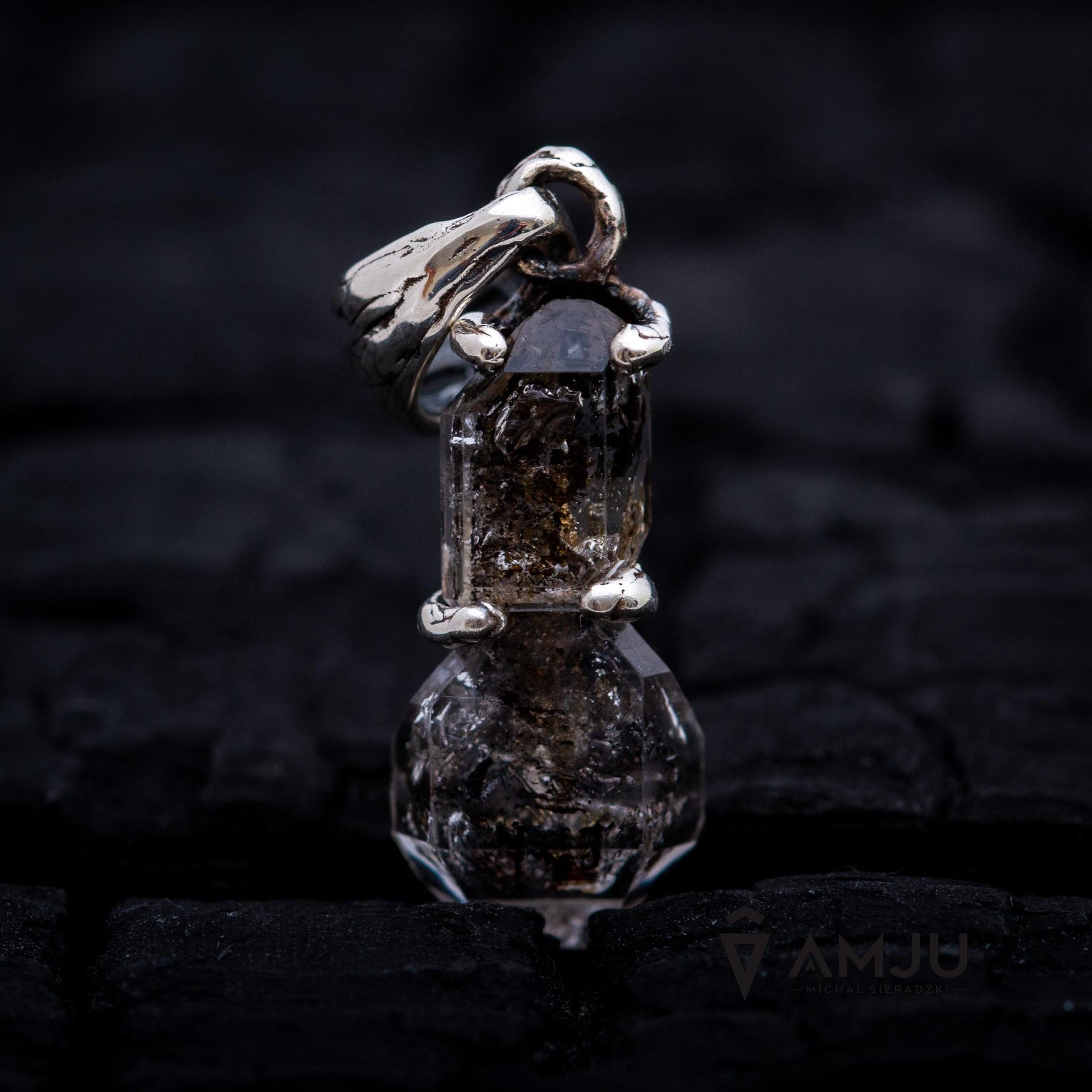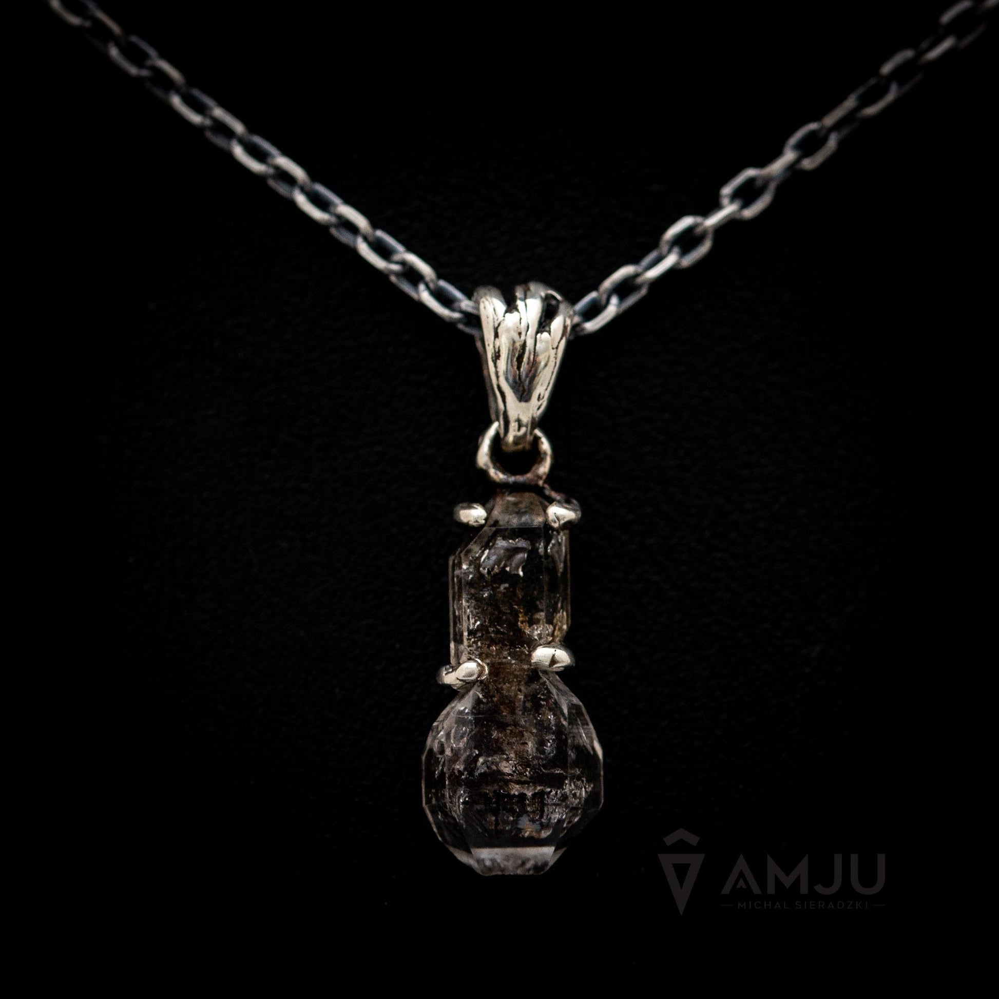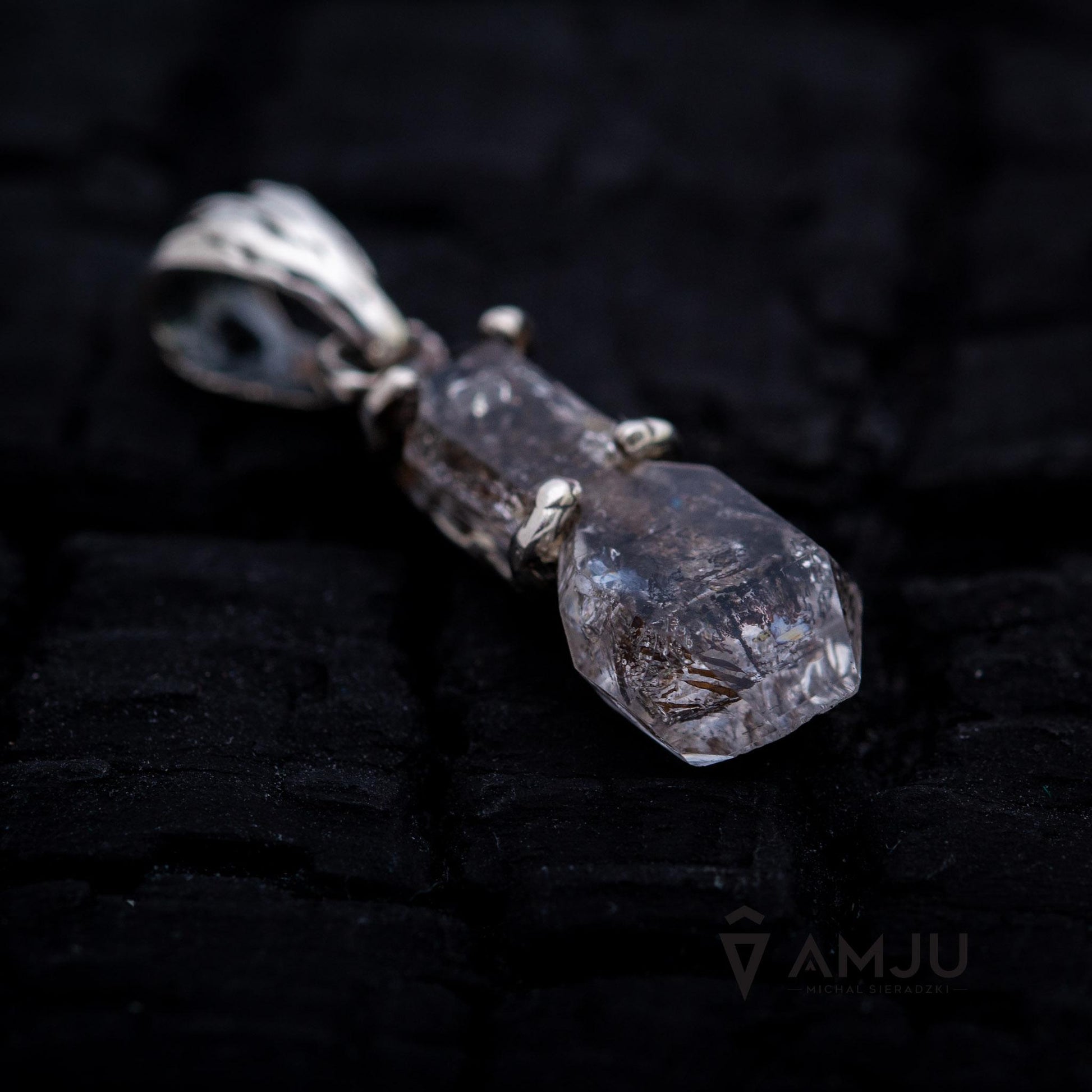 A Subtle pendant with Tibetan Scepter Quartz Crystal, a variety of Rock Crystals. This unique gemstone hasn't been polished, its form is fully natural. Inside are embedded little particles of carbon and petroleum that glow in UV light. The delicate setting is a 925 sterling silver, oxidated and polished.